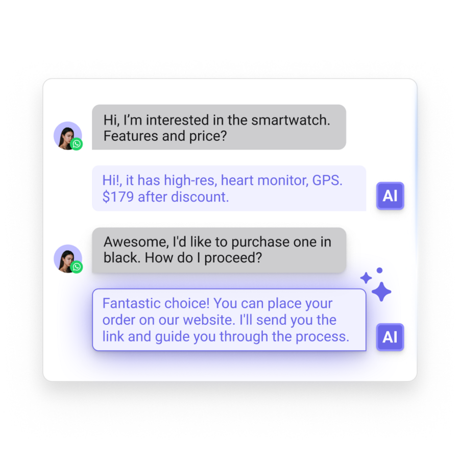 Automate bookings, share product info instantly with Meta Catalogs and accelerate high-value or critical deals with voice calls.