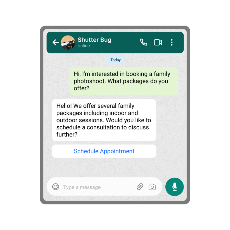 Automate bookings, share product info instantly with Meta Catalogs and accelerate high-value or critical deals with voice calls.