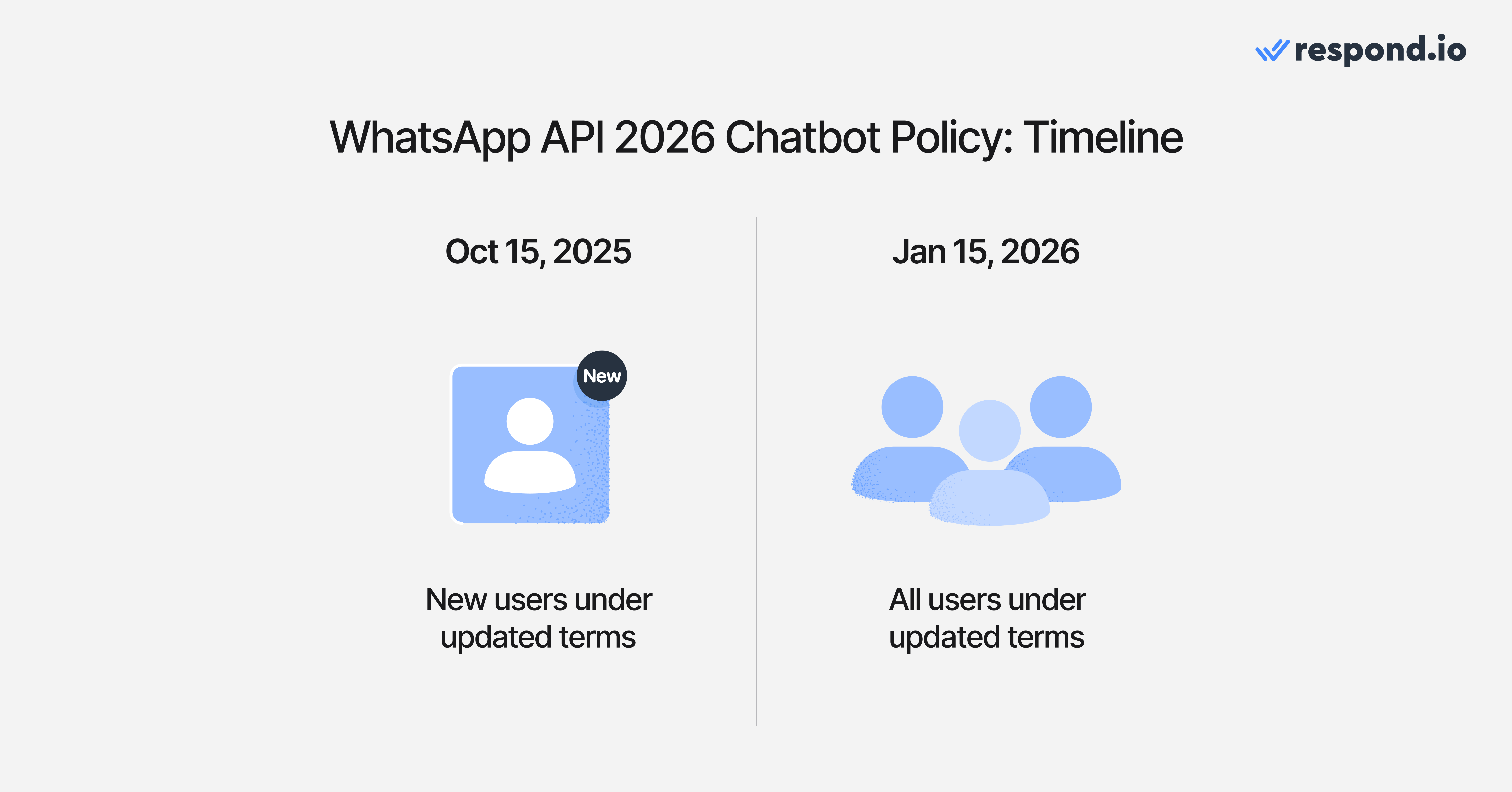 ستسري السياسة على جميع الشركات التي تستخدم واجهة برمجة تطبيقات واتساب للأعمال اعتبارًا من 15 يناير 2026. كان المستخدمون الجدد خاضعين لهذه القواعد المحدثة منذ 15 أكتوبر 2025. لن تتأثر الشركات التي تستخدم respond.io بشكل صحيح لأغراض الرسائل التجارية بهذا التحديث.