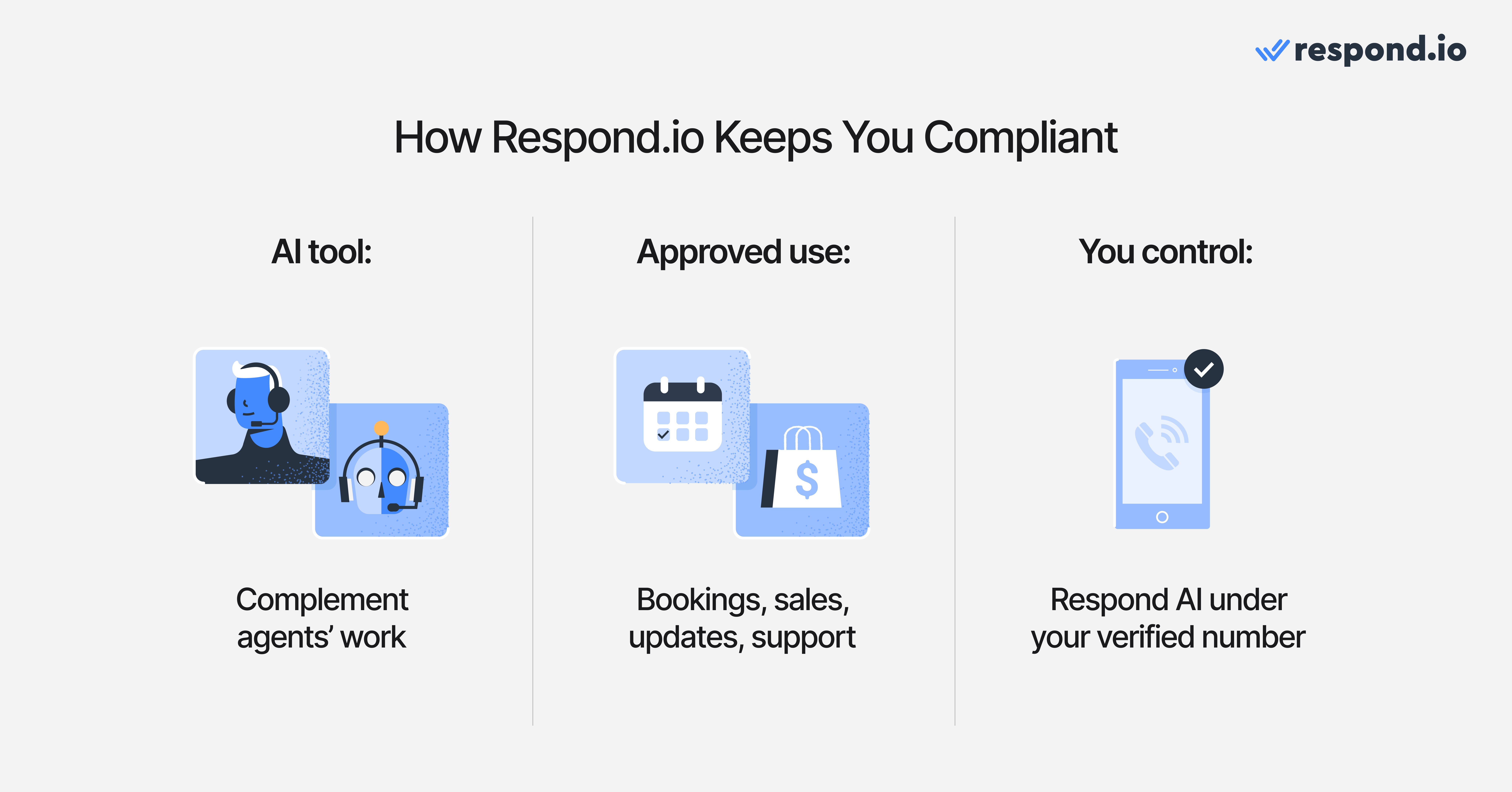 يظل مستخدمو respond.io متوافقين تمامًا، حيث تم بناء الذكاء الاصطناعي وأتمتة العمليات الخاصة بهم للاستخدامات التجارية المعتمدة.