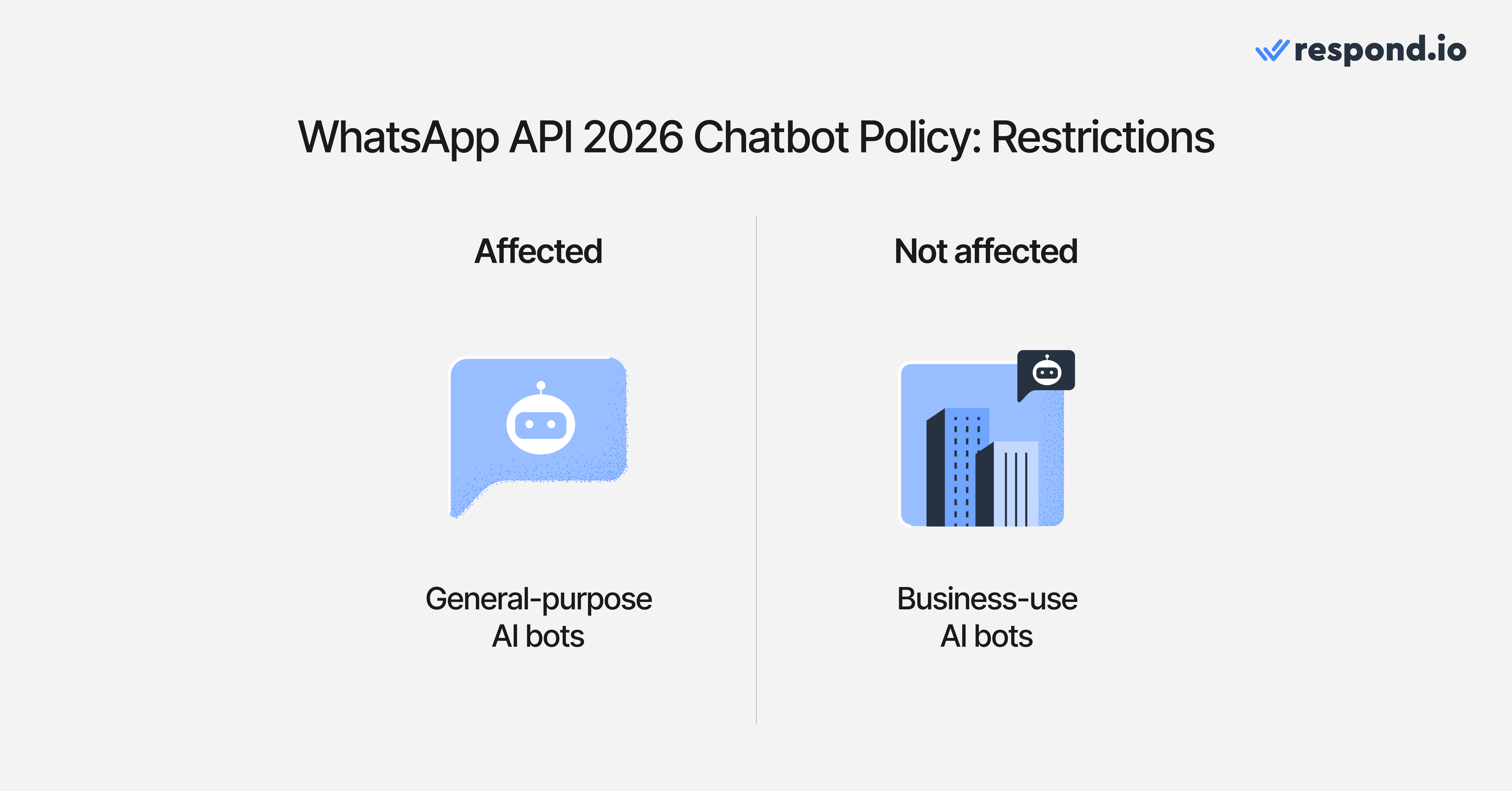 لا، تقوم واتساب بحظر روبوتات الدردشة الذكية متعددة الأغراض فقط مثل الروبوتات على طراز ChatGPT التي تجيب على أسئلة مفتوحة. روبوتات الدردشة الذكية المستخدمة للدعم، والمبيعات، والإشعارات والتحديثات، مثل وكلاء الذكاء الاصطناعي في respond.io، لا تزال مسموحًا بها بموجب سياسة واتساب.