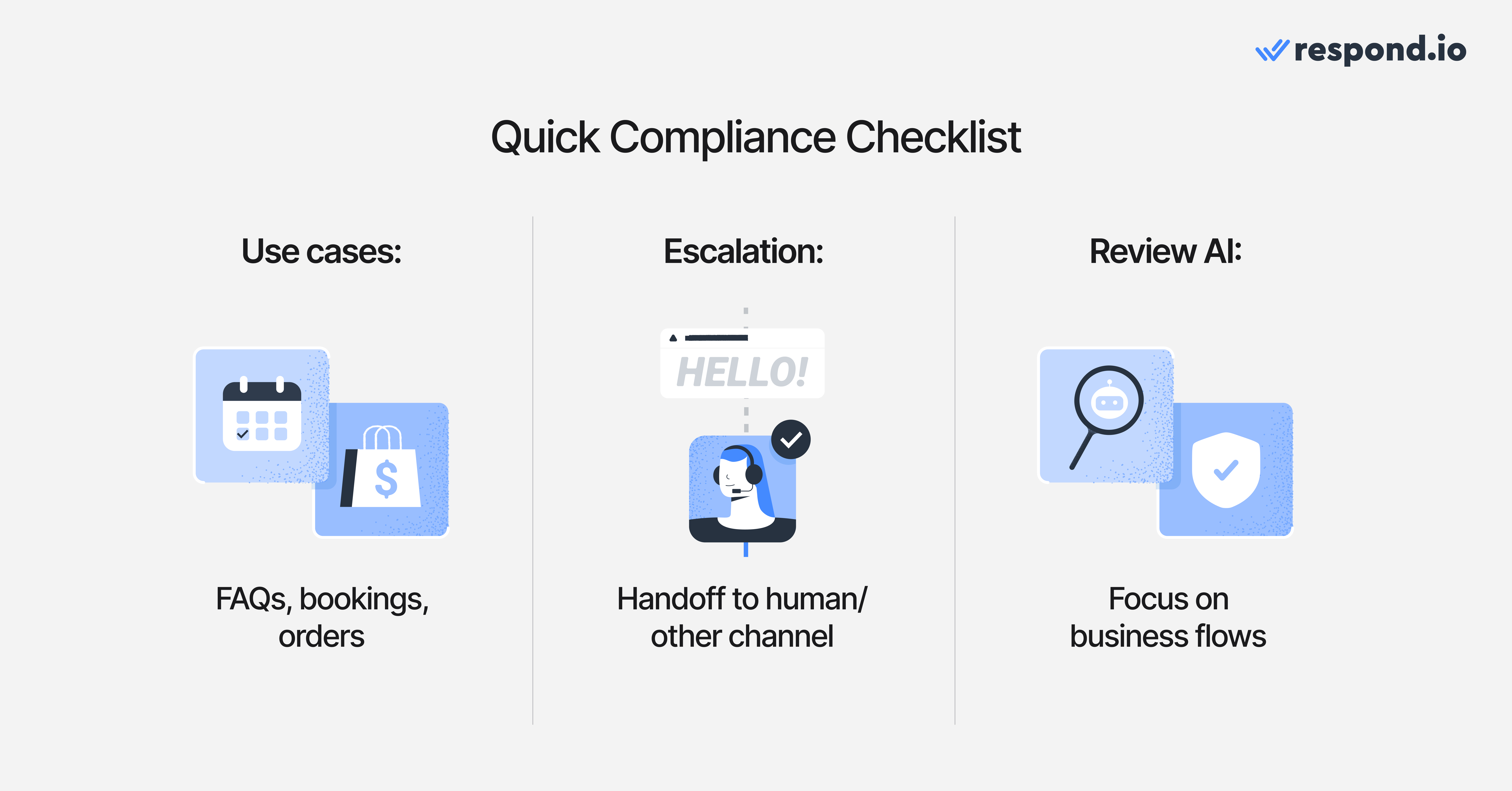 للبقاء متوافقًا، تأكد من أن وظائف روبوتك موجهة نحو الاستفسارات الداعمة أو المعاملات، ويمكنها تصعيد المحادثات بسرعة إلى وكيل بشري عند الحاجة.