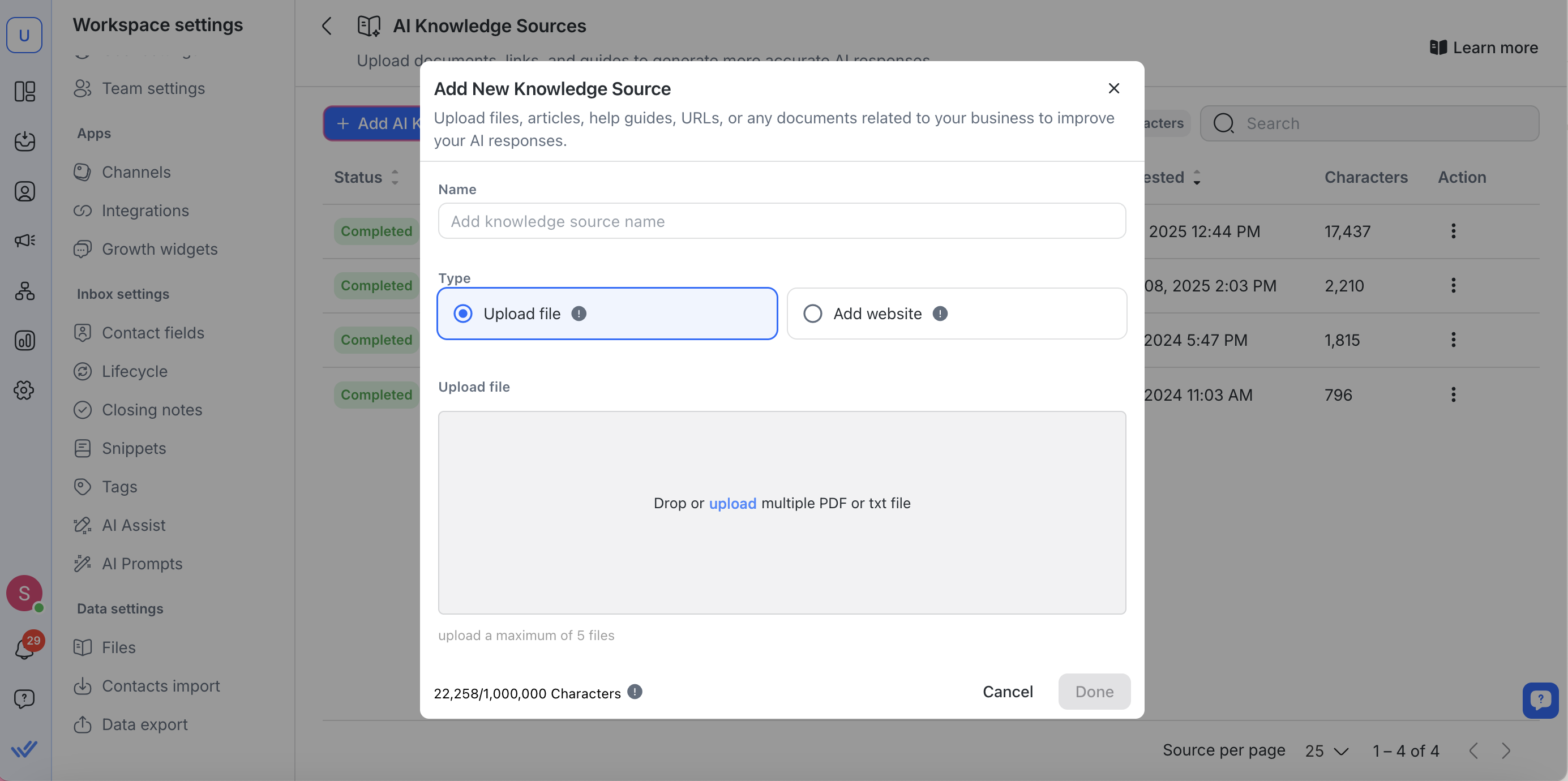 قم بتحميل المعلومات، مثل رابط إلى الأسئلة الشائعة حول عملك أو منتجك، حتى تتمكن AI Assist من الرجوع إليه عند صياغة ردود العملاء. يعد هذا الخيار مفيدًا للشركات التي لديها بالفعل معلومات موجودة وجاهزة للتحميل.