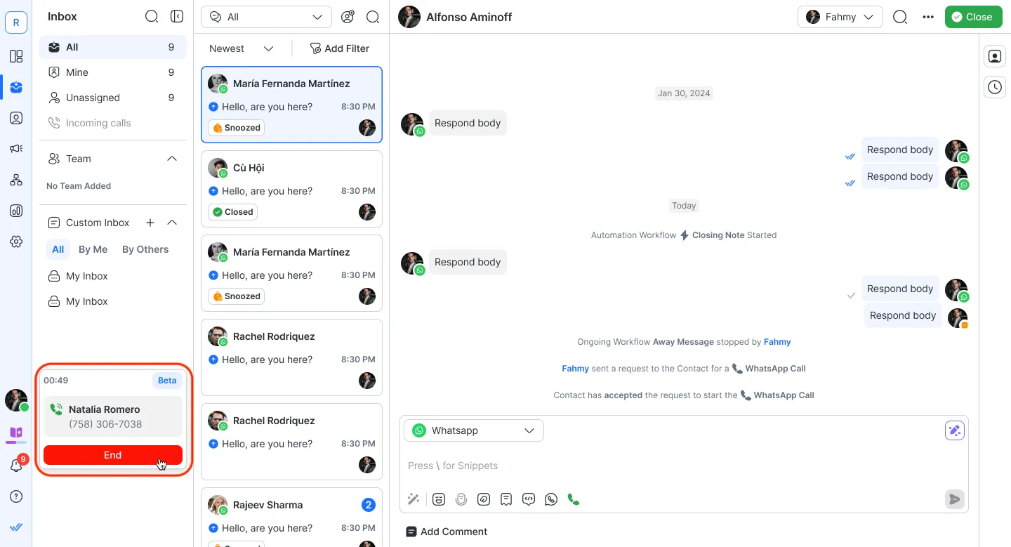 تتيح مكالمات WhatsApp لشركتك إجراء واستقبال مكالمات صوتية مع العملاء مباشرة من خلال منصة response.io.