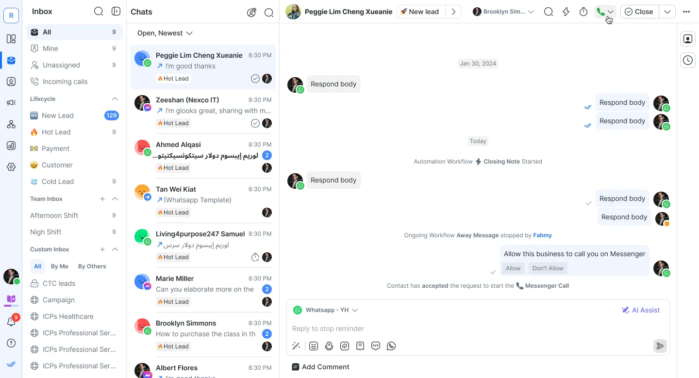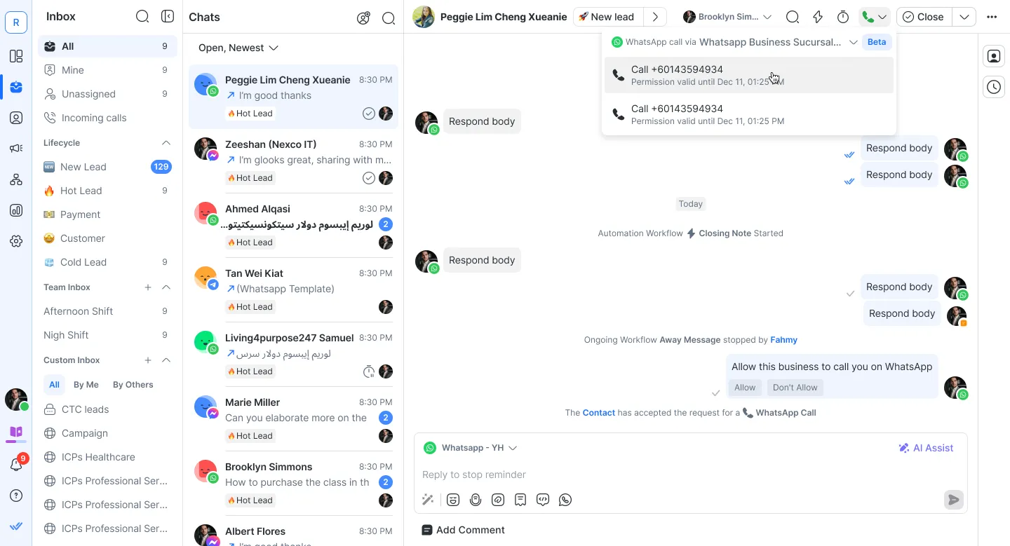 لا. لا يؤدي استلام مكالمة WhatsApp إلى تفعيل حدث فتح محادثة على respond.io.