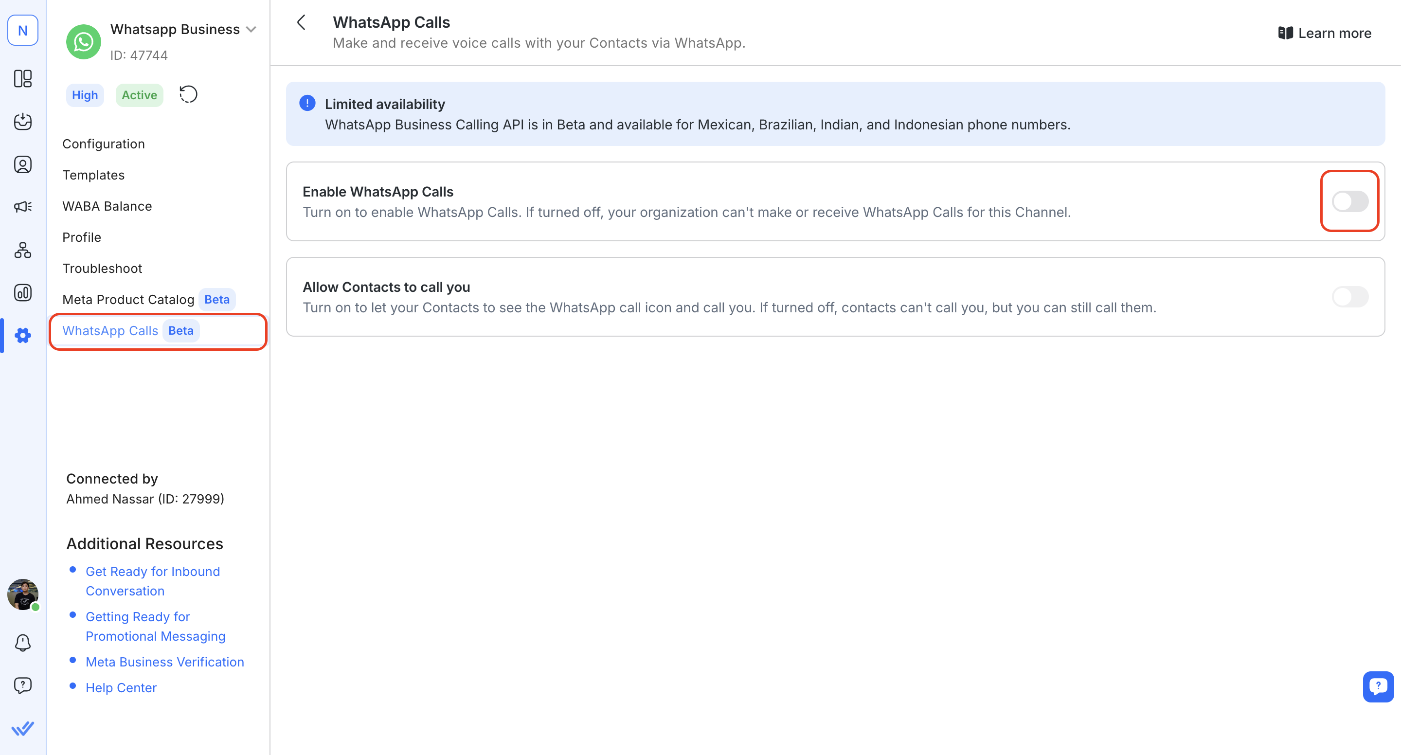 متطلبات الأهلية: يجب أن يكون لرقم WhatsApp Business الخاص بك حد رسائل لا يقل عن 1,000 محادثة تبدأها الأعمال في فترة 24 ساعة متتالية لتمكين مكالمات WhatsApp. تعرف على المزيد حول حدود الرسائل في WhatsApp هنا.