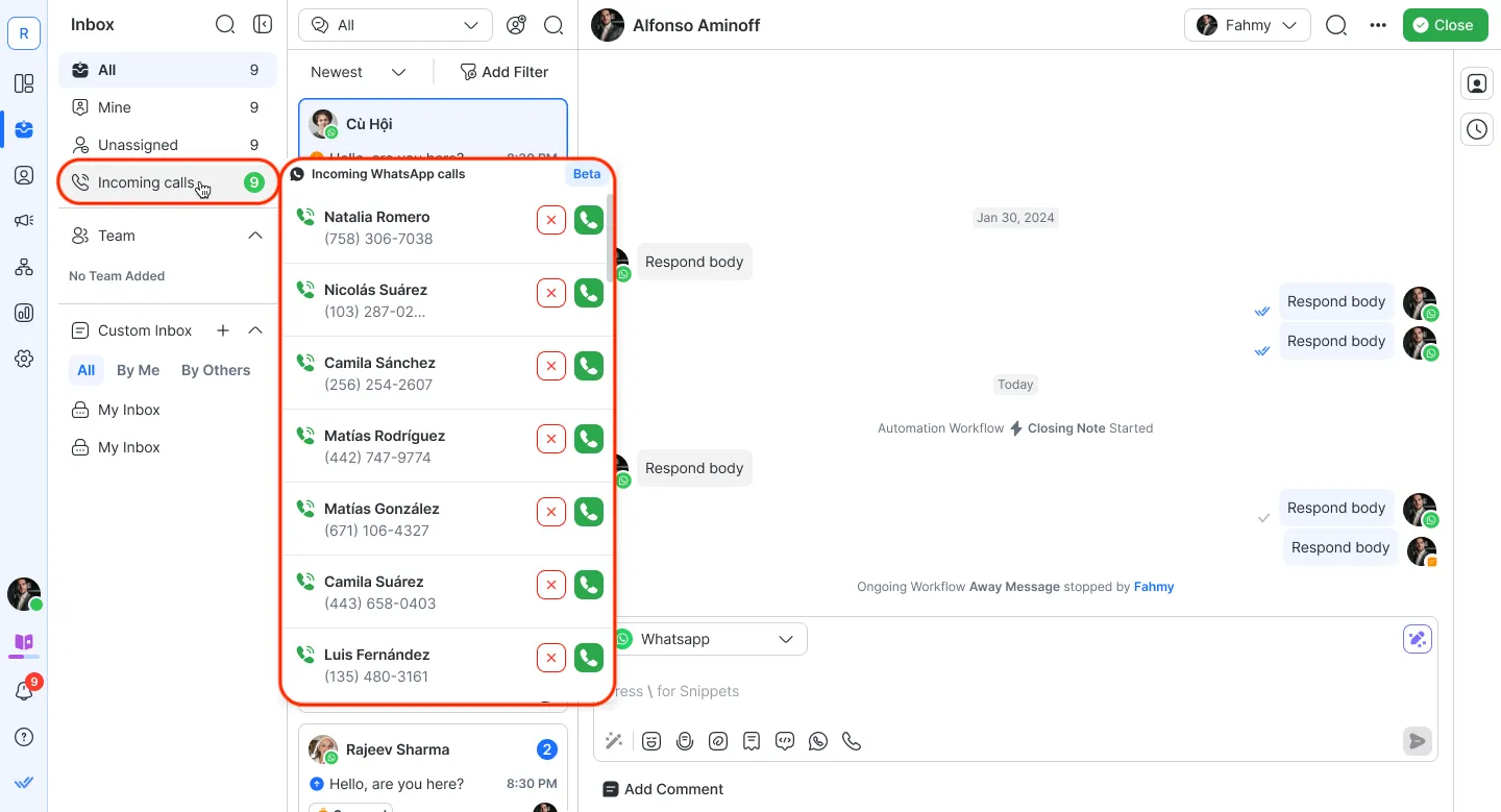 هل تفتح مكالمة WhatsApp الواردة محادثة على respond.io؟