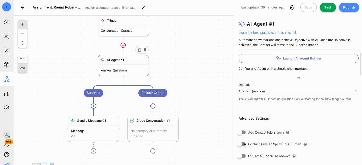 A robust automation builder lets you create workflows to automate routine business processes quickly and consistently without relying on agents. Some platforms let you integrate AI in automated workflows under your preferred conditions. This allows your AI agent to step in at the right moment and take the wheel.