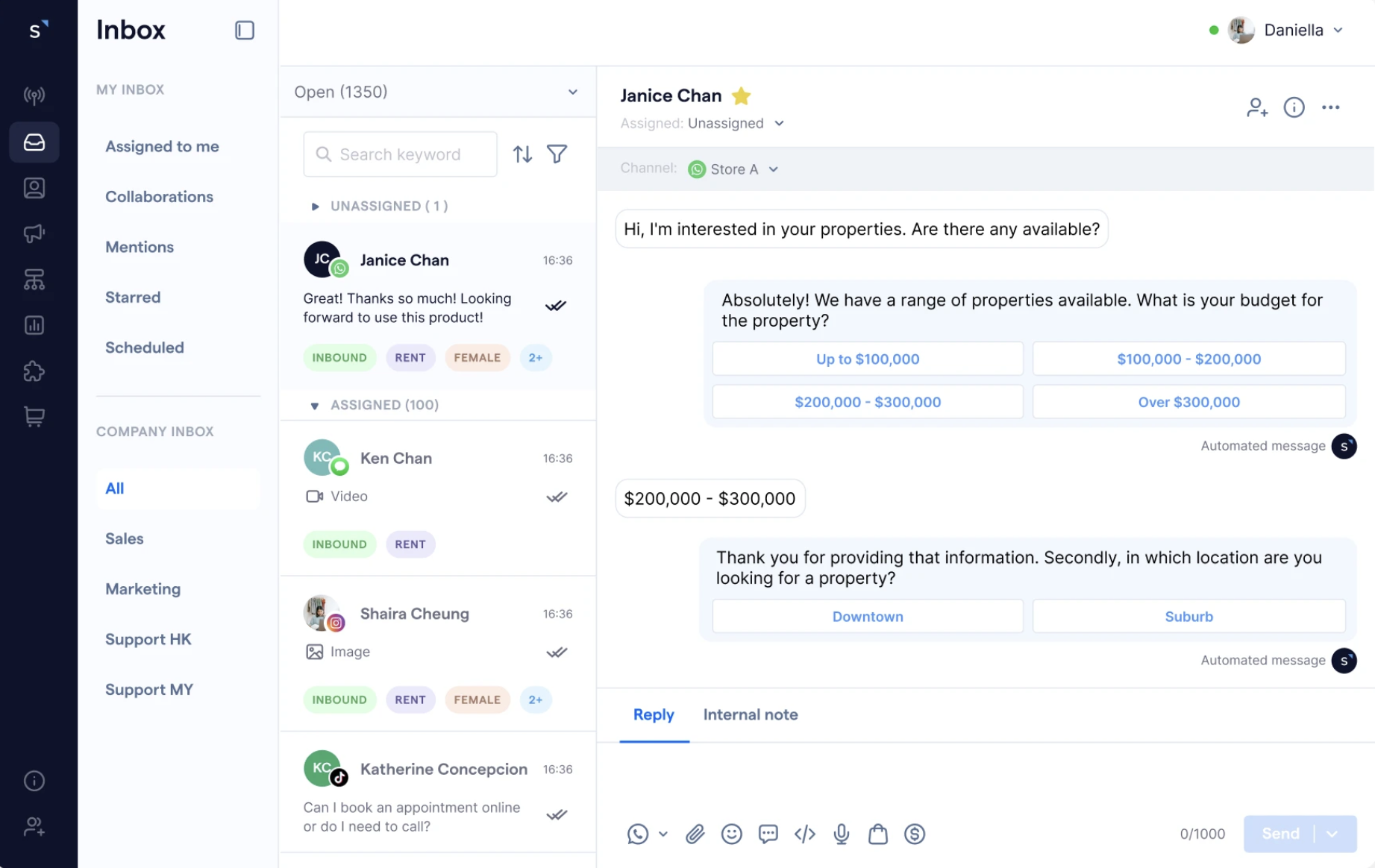 Workflow automation: Use the automation builder to capture leads, send follow-ups, route messages and assign tasks.