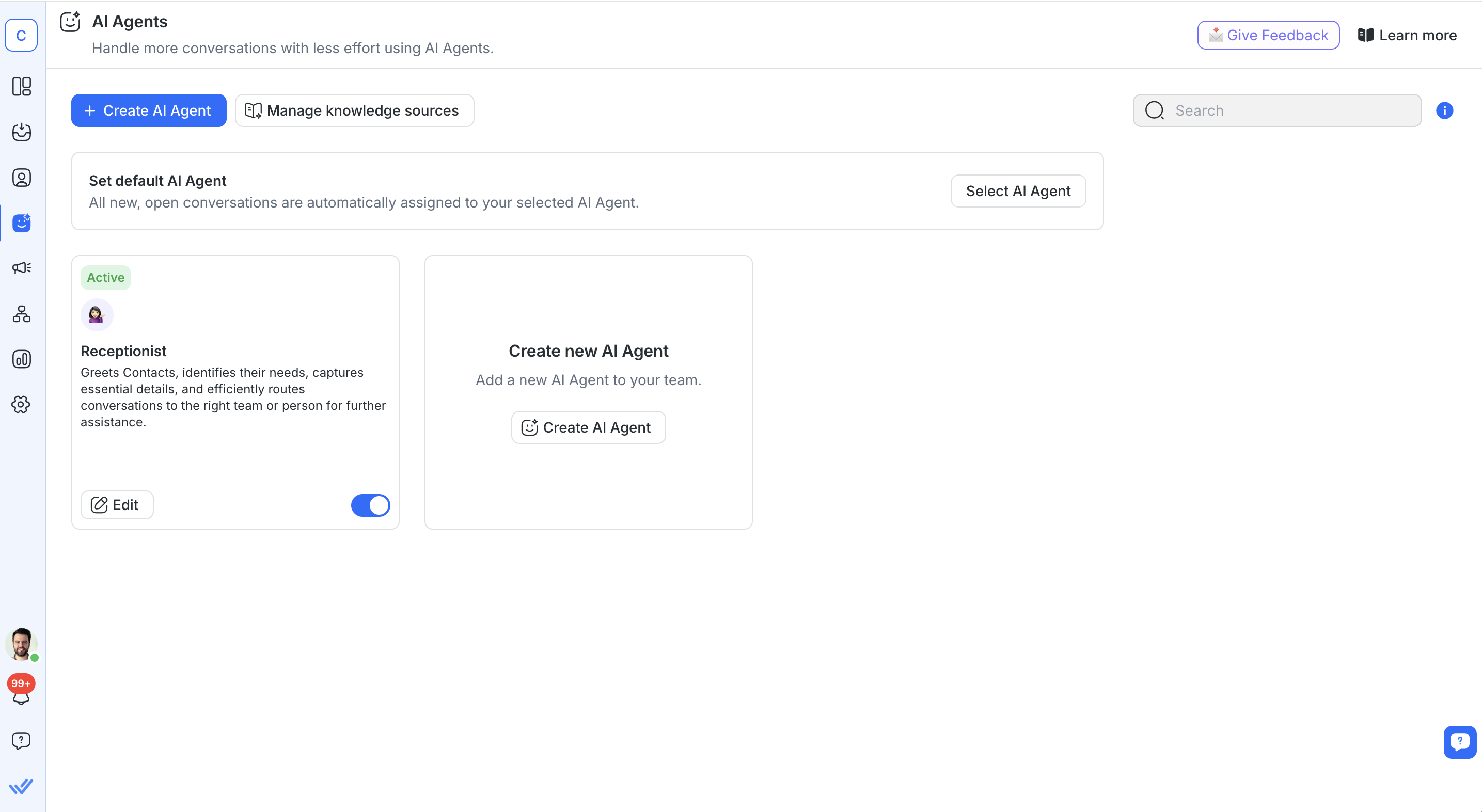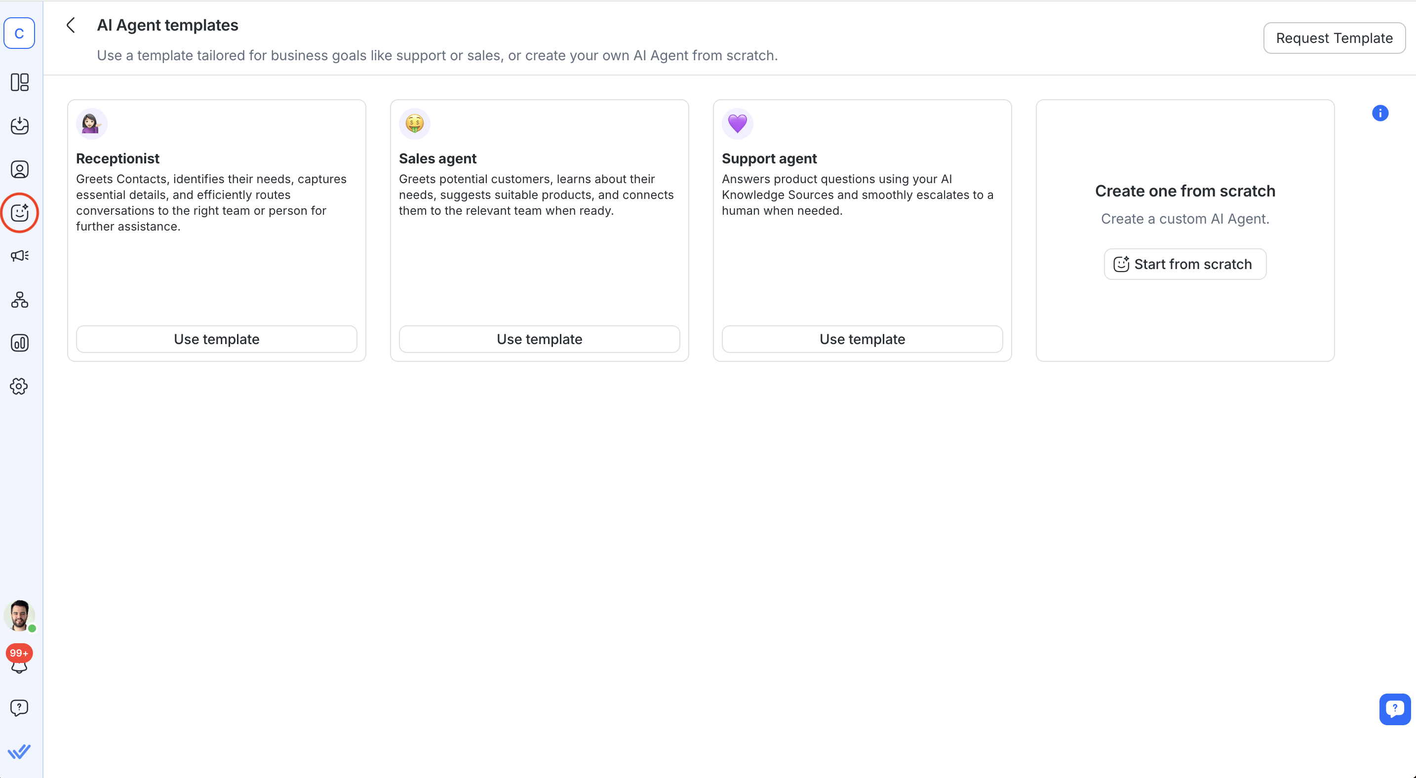 1. Open the AI Agent Module on the left column. Select an AI Agent template (recommended for first-timers) or create one from scratch.