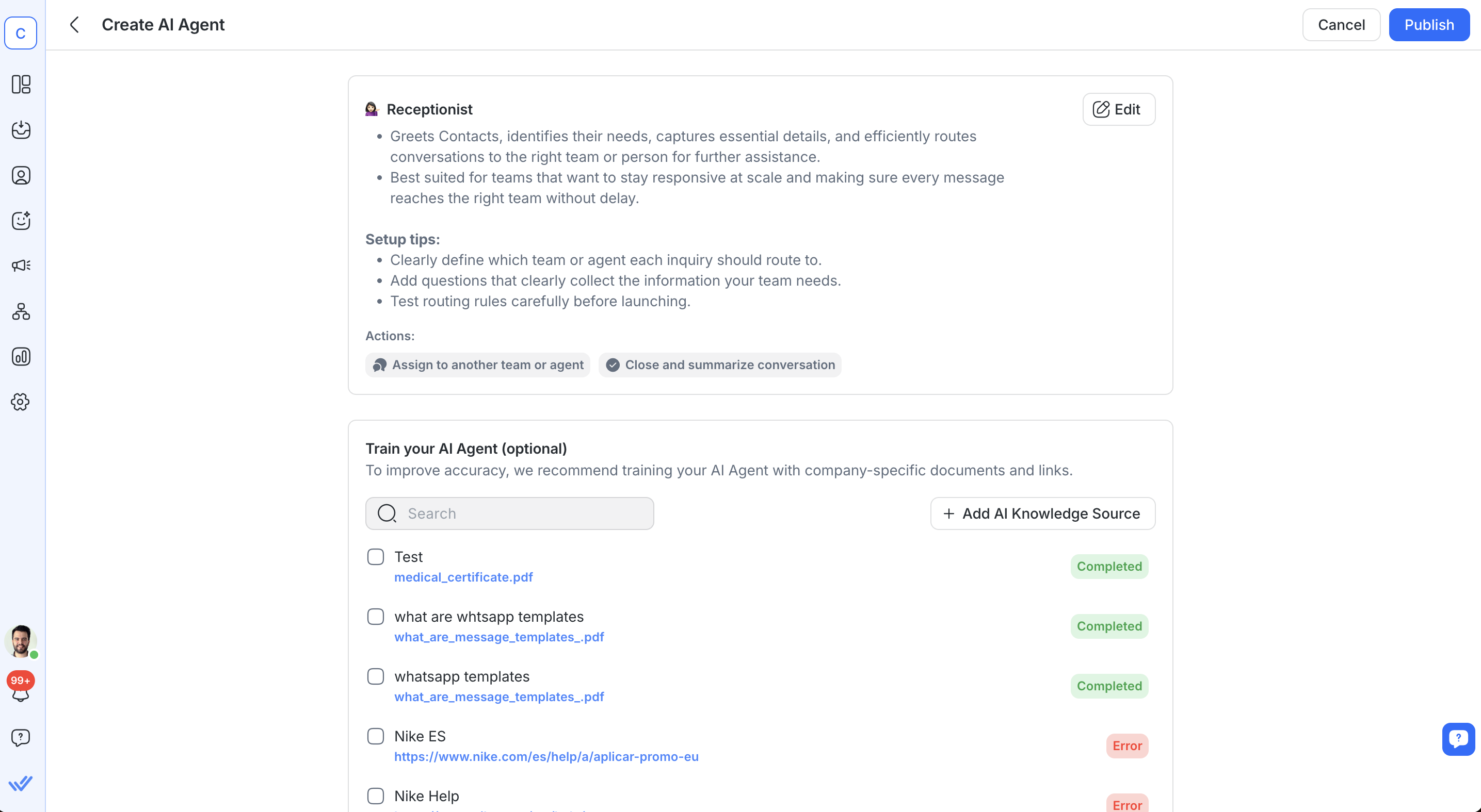 2. Review and customize your AI Agent's configuration, actions and knowledge sources. Note that AI Agents can update CRM fields, change Lifecycle stages, tag or categorize contacts, summarize entire conversations and even trigger Workflows when contact events occur. They also process files like images and PDFs, letting customers share documents directly in TikTok conversations.
