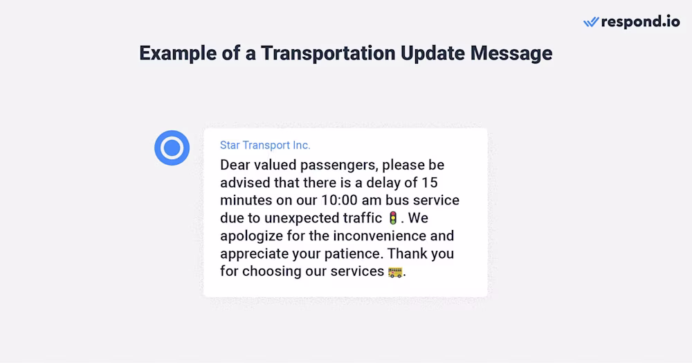1. “Dear valued passengers, please be advised that there is a delay of 15 minutes on our 10:00 am bus service due to unexpected traffic 🚦. We apologize for the inconvenience and appreciate your patience. Thank you for choosing our services 🚌.”