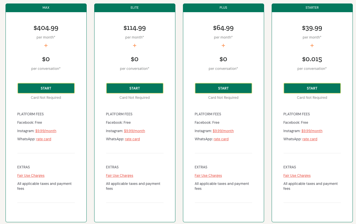 Max | $404.99 | 5m conversations per month | *$0.00049 per conversation |