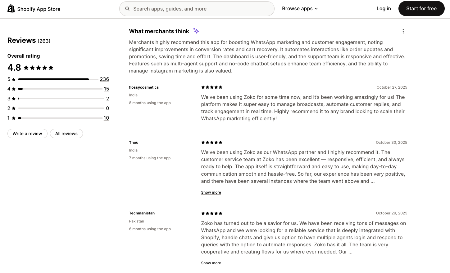 Users praise Zoko for its automation, seamless Shopify integration, chatbots and broadcasting. Many see a lot of improvement in their efficiency and sales, highlighting features such as cart recovery workflows via WhatsApp.