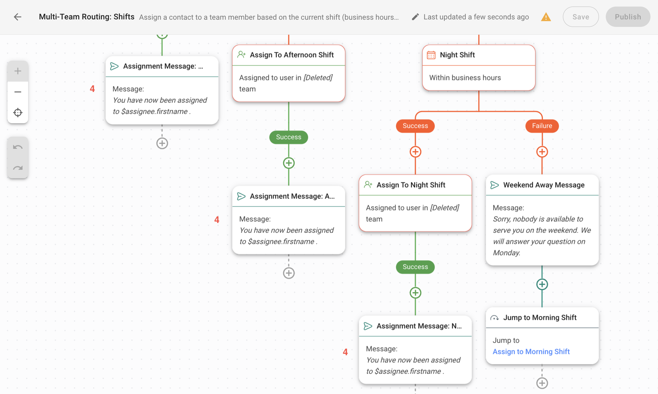 Kontakte, die Sie außerhalb Ihrer Geschäftszeiten, in diesem Fall am Wochenende, kontaktiert haben, werden an die Störungsabteilung weitergeleitet. Dieser Zweig sendet eine Abwesenheitsnachricht an die Kontakte und verfügt über einen Sprungschritt , um den Kontakt einem Agenten im Team für die nächste Schicht zuzuweisen, in diesem Fall die Morgenschicht. Sie können diese Schritte nach Bedarf konfigurieren und anpassen.