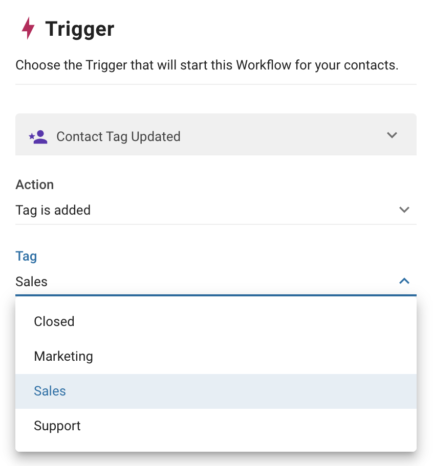 Um diesen Workflow zu konfigurieren, wählen Sie eine Aktion aus, die als Trigger fungiert. Die Optionen sind, wenn ein Tag einem Kontakt hinzugefügt wird oder wenn ein Tag aus dem Kontakt entfernt wird.