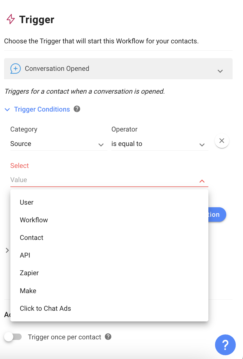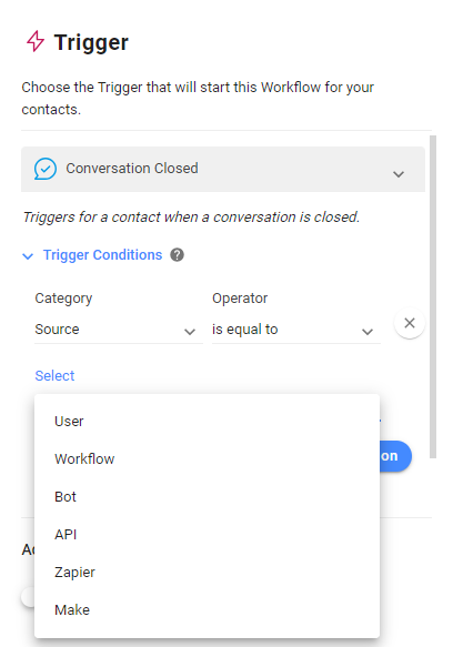 Die Triggerbedingung für diesen Workflow ist auf die Quelle beschränkt, die festlegt, wie die Unterhaltung geöffnet wurde. Werden keine Bedingungen hinzugefügt, wird der Workflow ausgelöst, wenn eine Unterhaltung eröffnet wird, unabhängig von der Quelle.