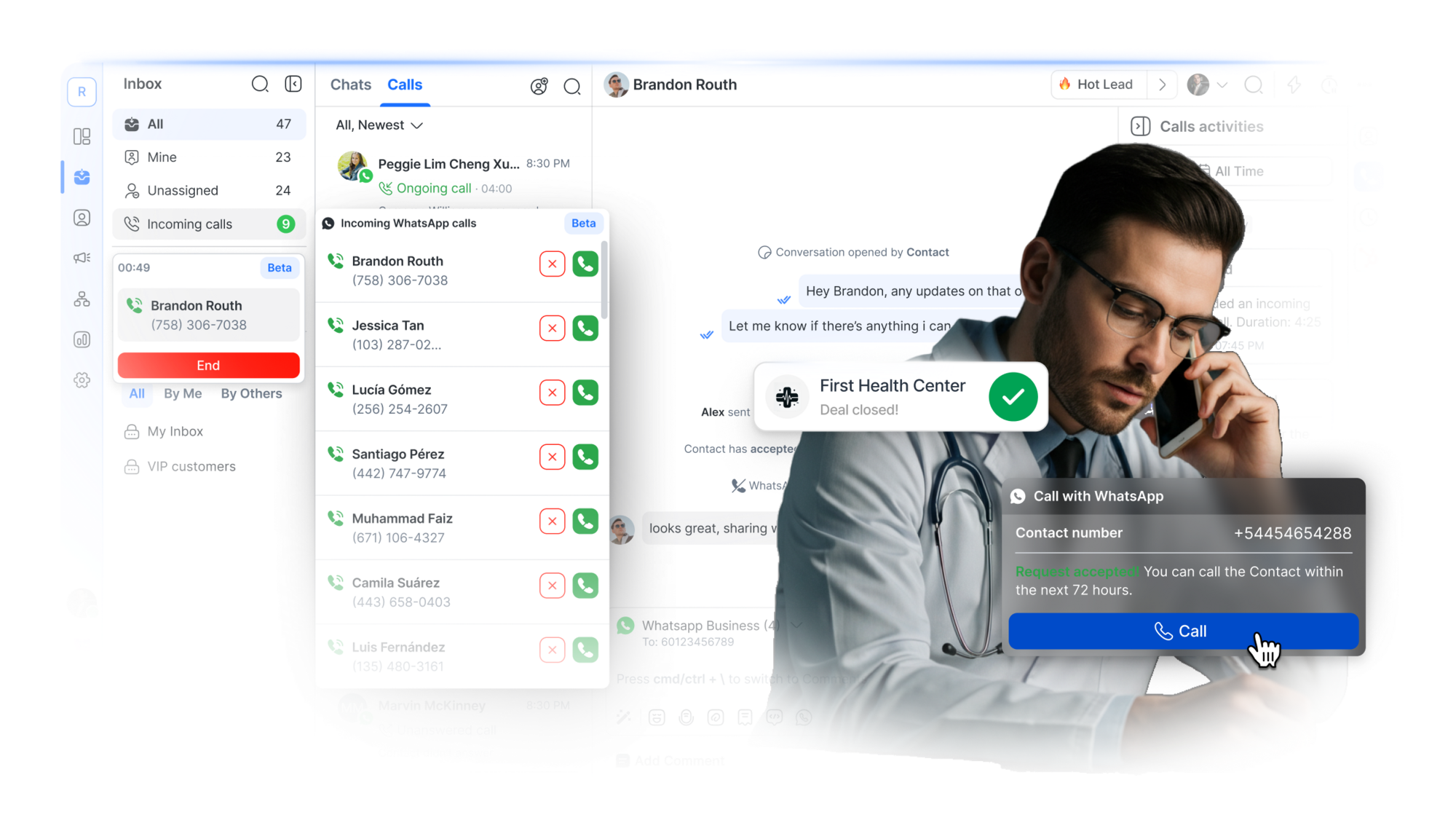- Verwalte eingehende Gespräche – Beantworte eingehende WhatsApp-Anrufe von Kunden.