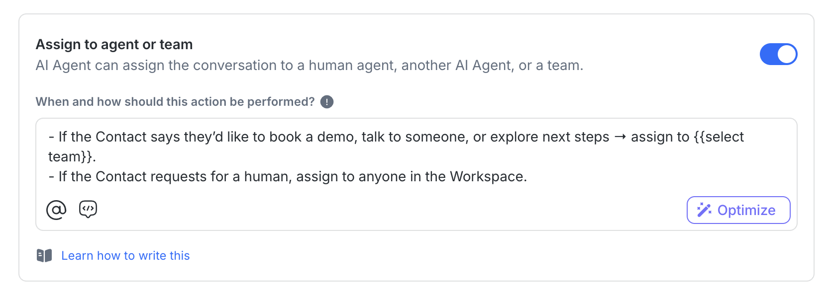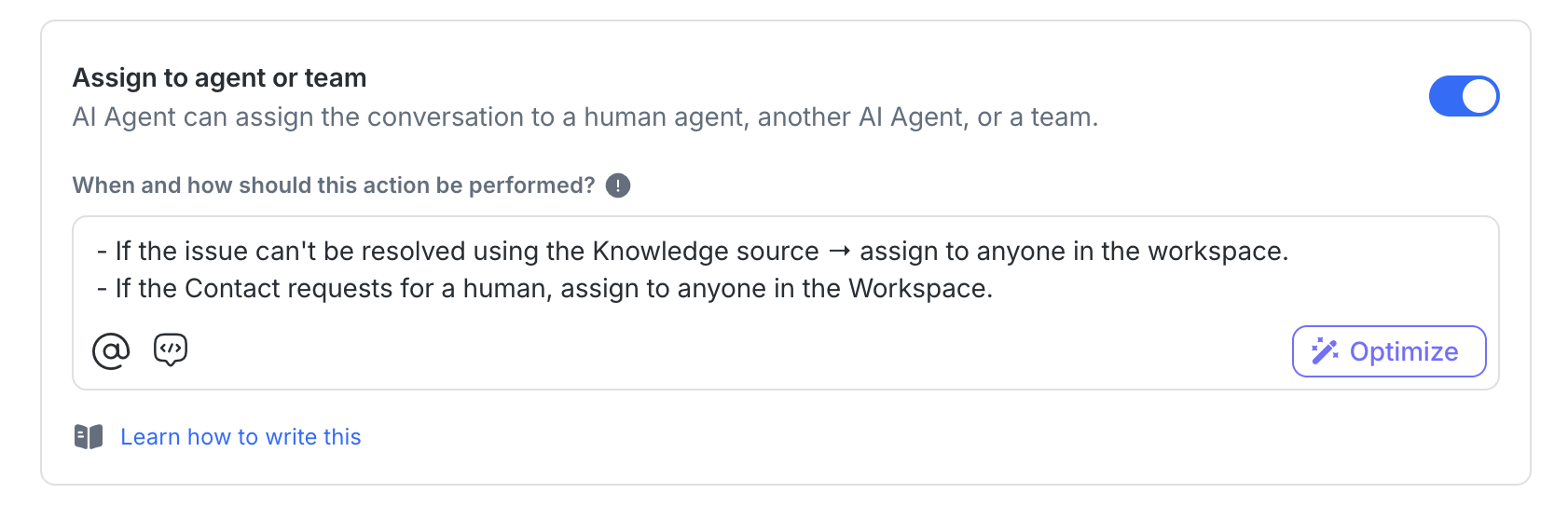 Assign to agent or team: Hands off to a human/another agent/team with context. Use â@â to mention an agent or team in the instructions box. For example: