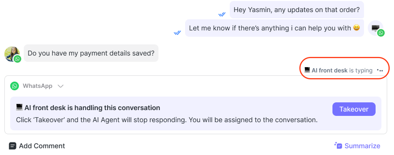 Once youâve taken over, the AI Agent will no longer respond to this conversation until itâs reassigned to the AI again.
