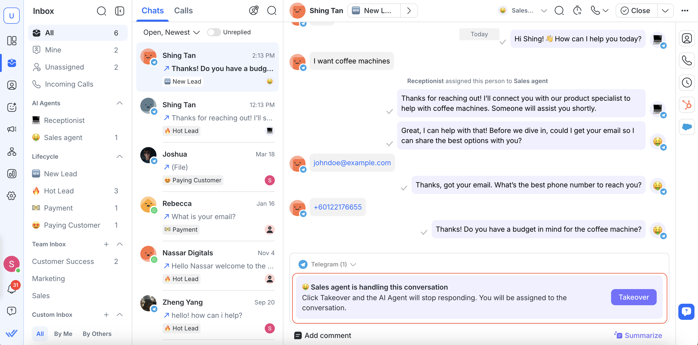 You can now manually take over a conversation that is currently being handled by your AI Agent. This feature ensures that when the AI provides an incorrect answer, canât address the customerâs query, or is taking too long to respond, a human agent can immediately step in.