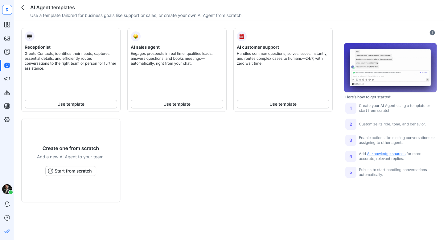 With ready-made templates, you can instantly deploy agents for common roles like handling inquiries, FAQs, or routing chats to the right team.