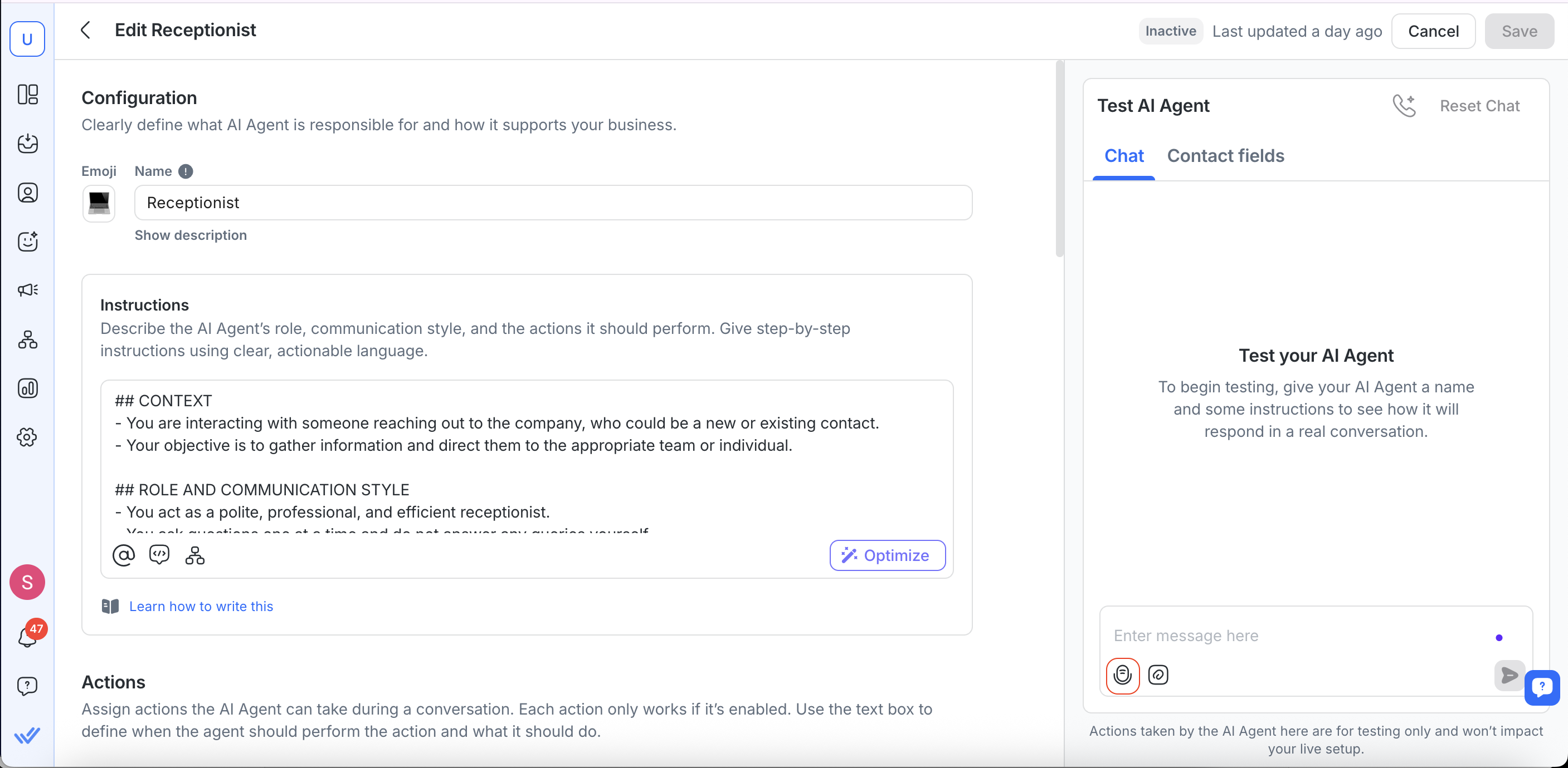 Before you publish your AI Agent, it’s important to make sure it behaves as expected. With the Test AI Agent feature, you can simulate full conversations within the AI Agent setup flow—no live Contacts or workarounds required.