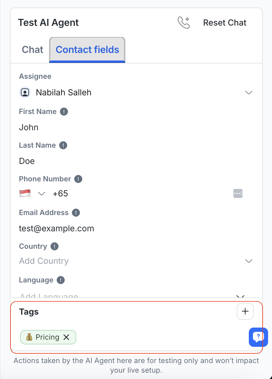 In the Test AI Agent panel, send a message that should trigger tag changes based on your instructions (for example: “Can I get pricing?”).