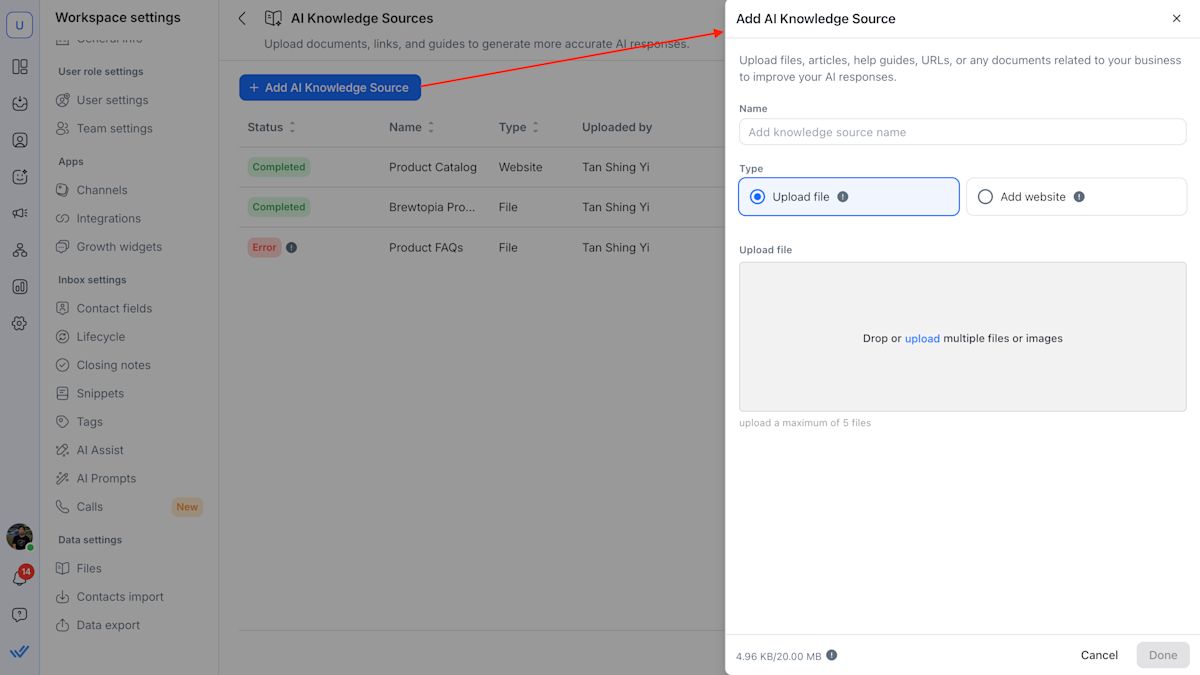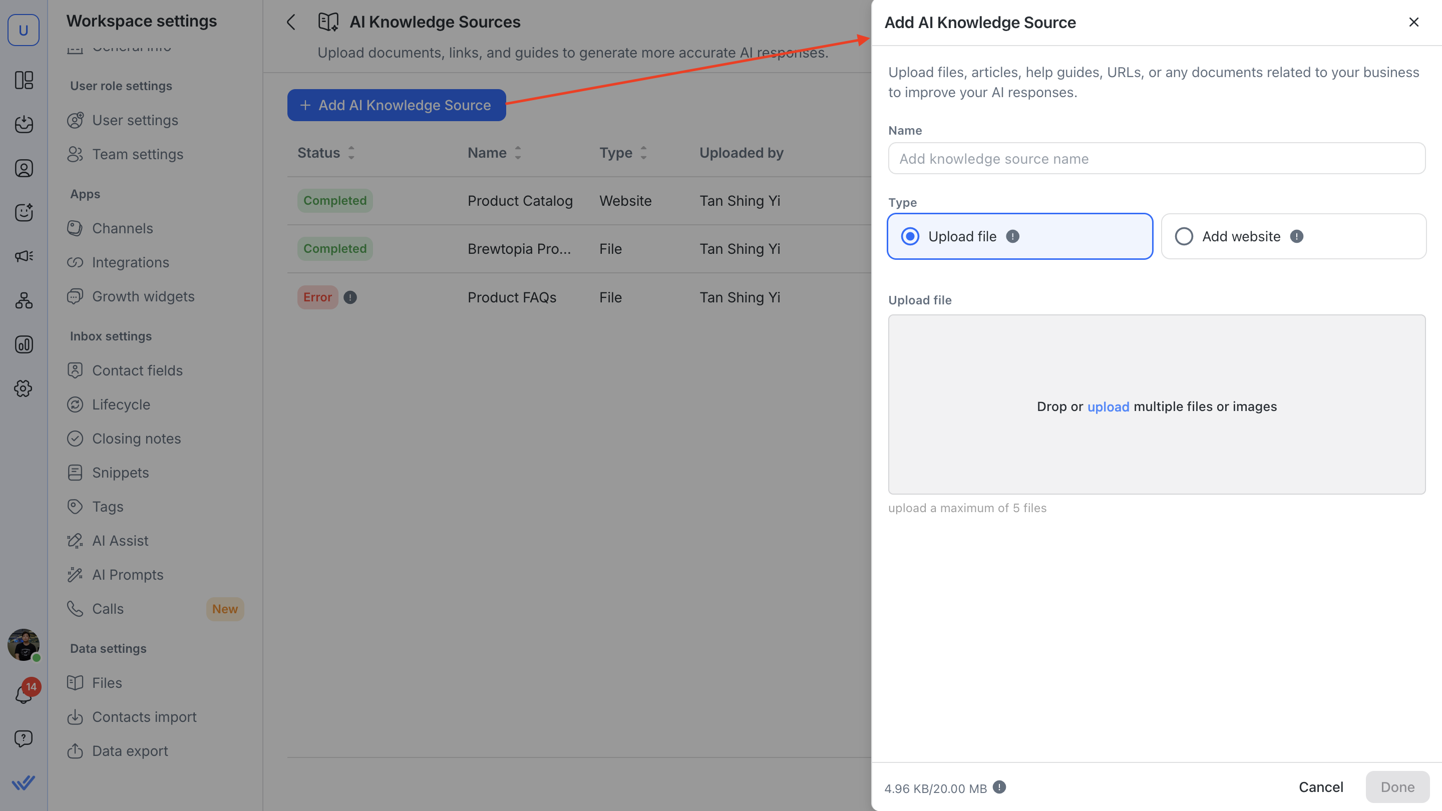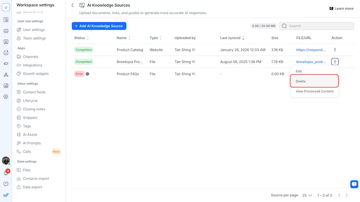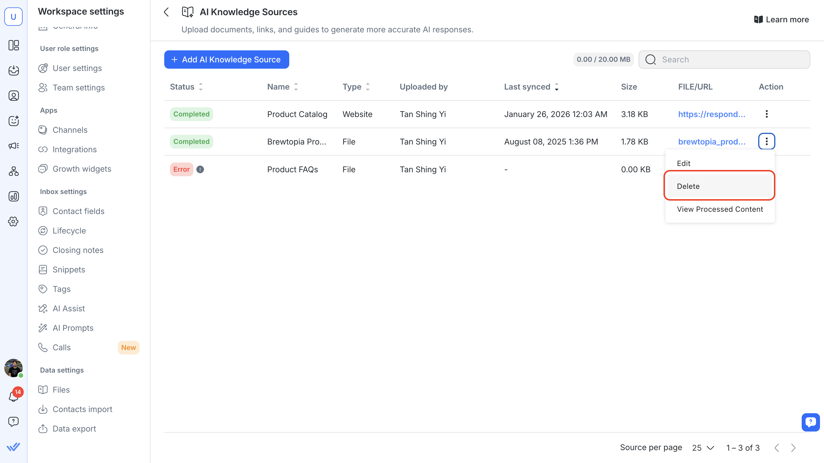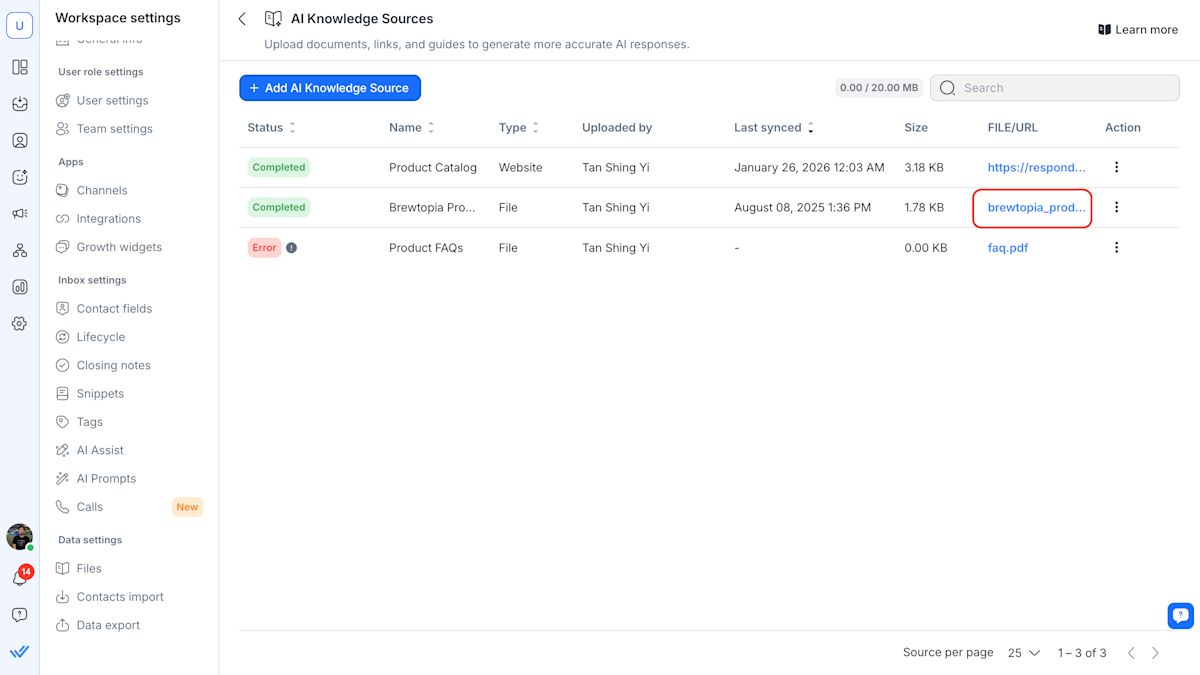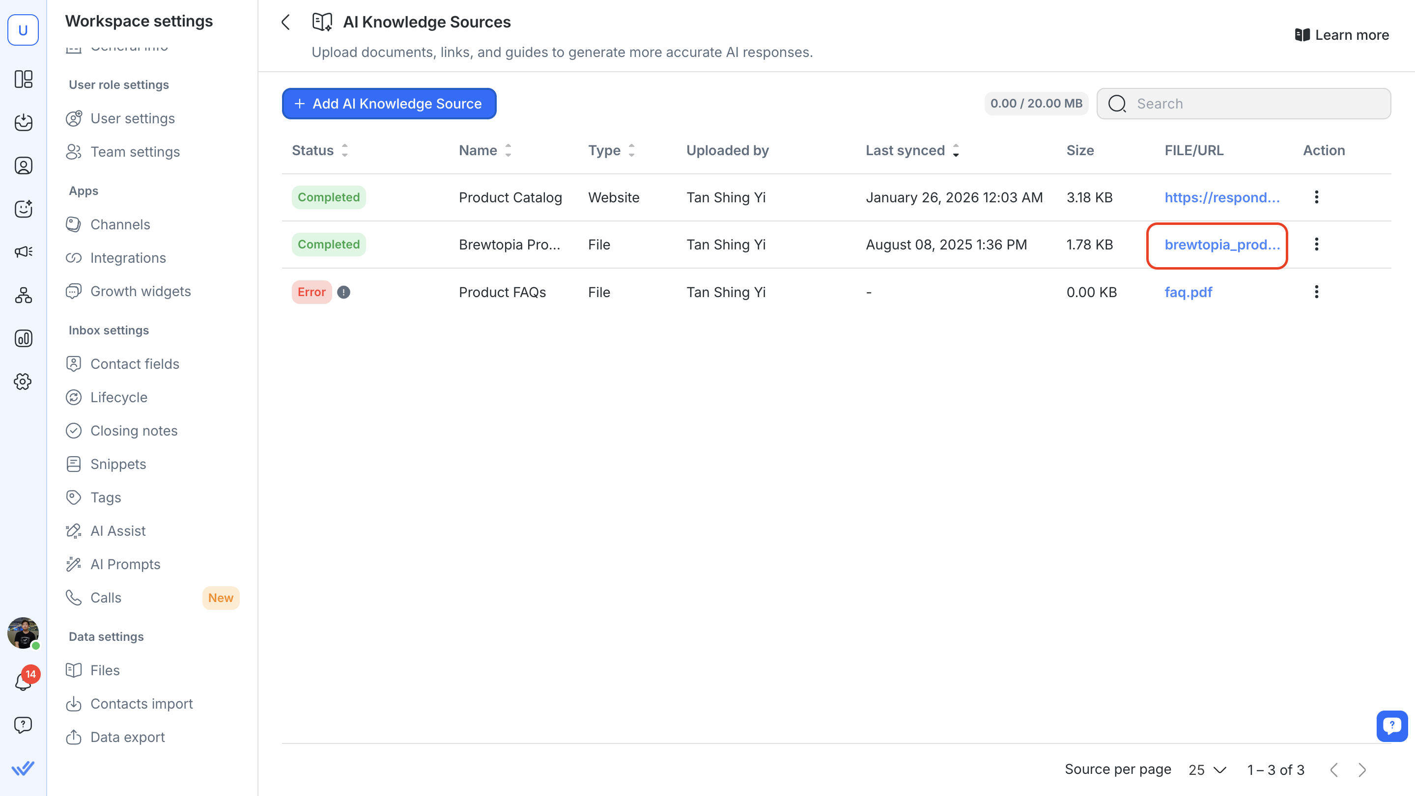 Click Add AI Knowledge Source > Enter a name > reupload the file.