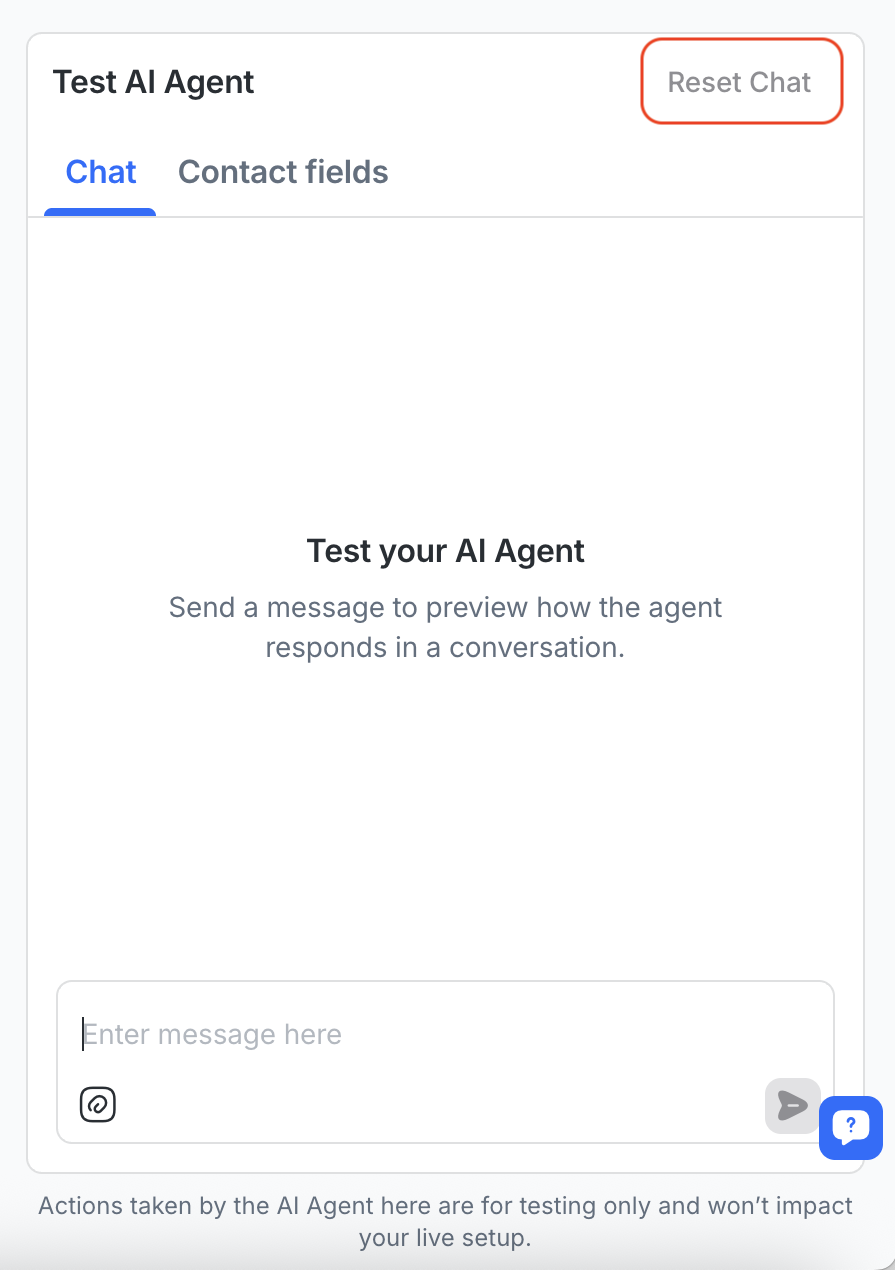 Before you publish your AI Agent, itâs important to make sure it behaves as expected. With the Test AI Agent feature, you can simulate full conversations within the AI Agent setup flowâno live Contacts or workarounds required.