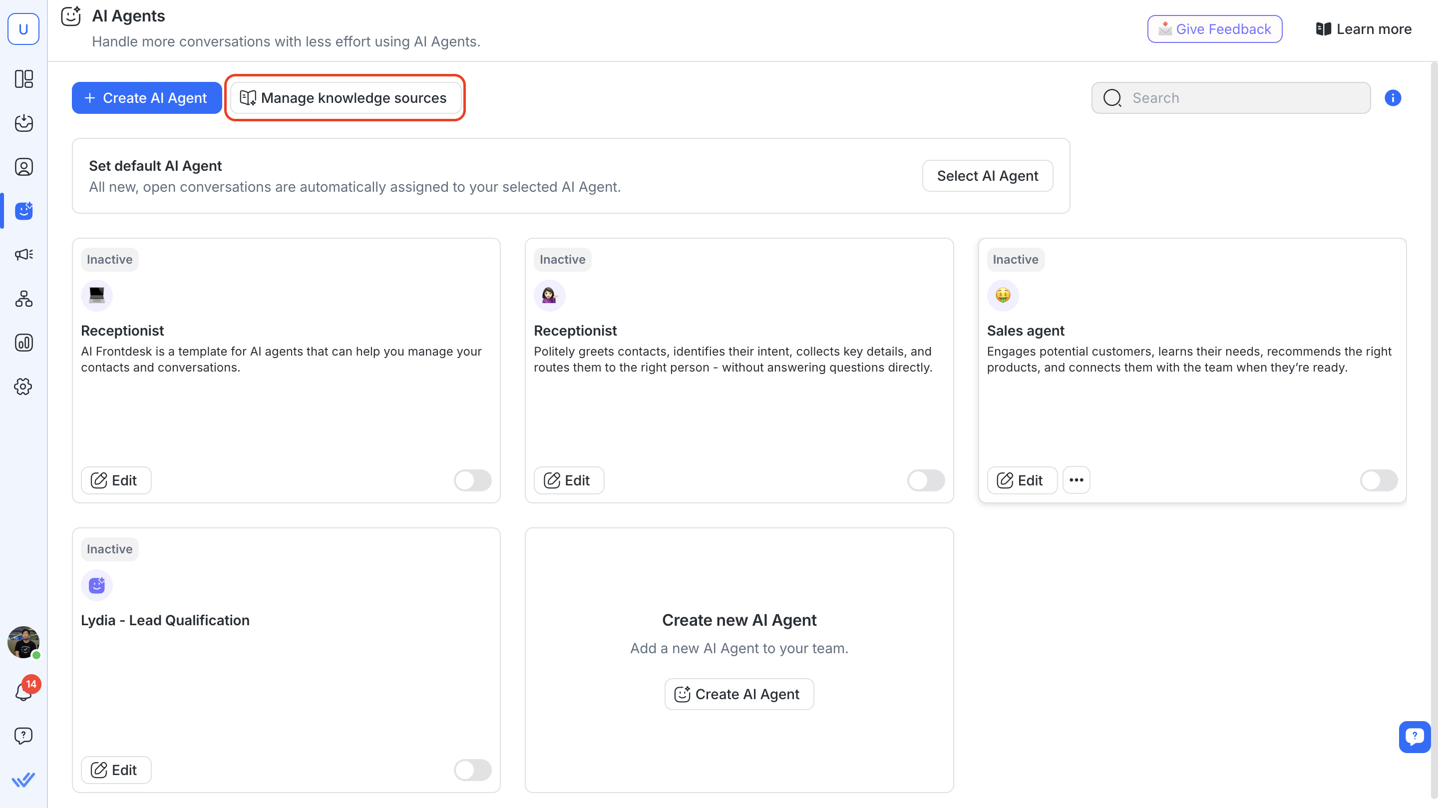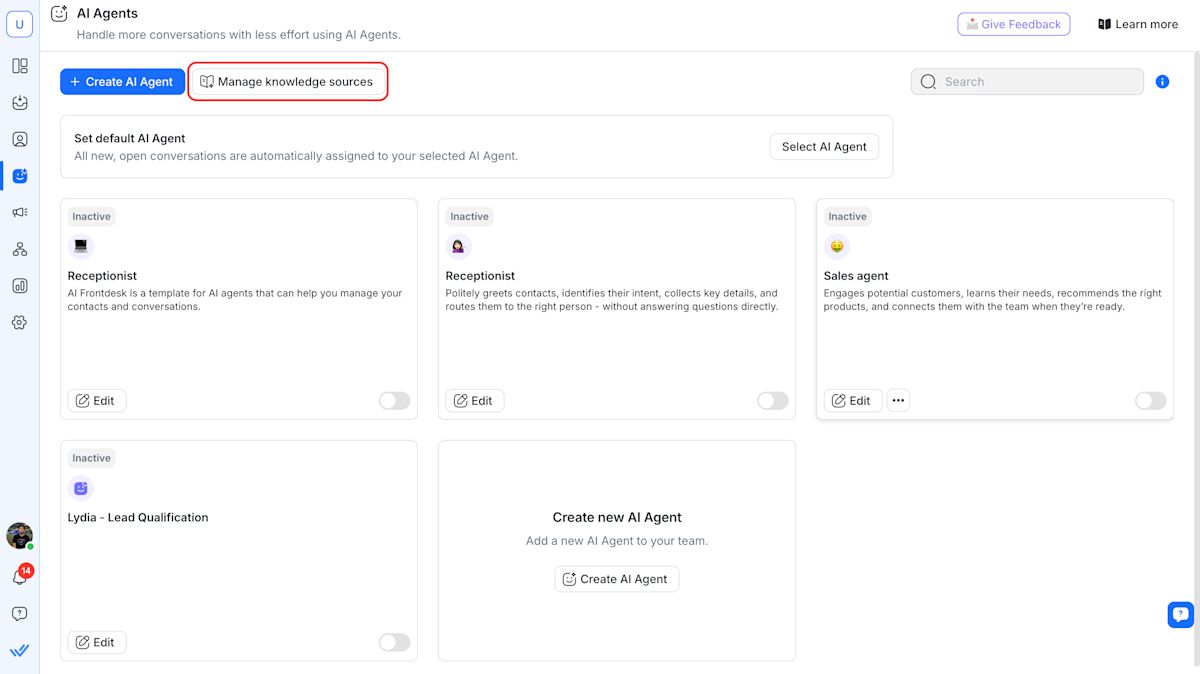 Navigate to AI Knowledge Sources in AI Agents > click Manage knowledge sources
