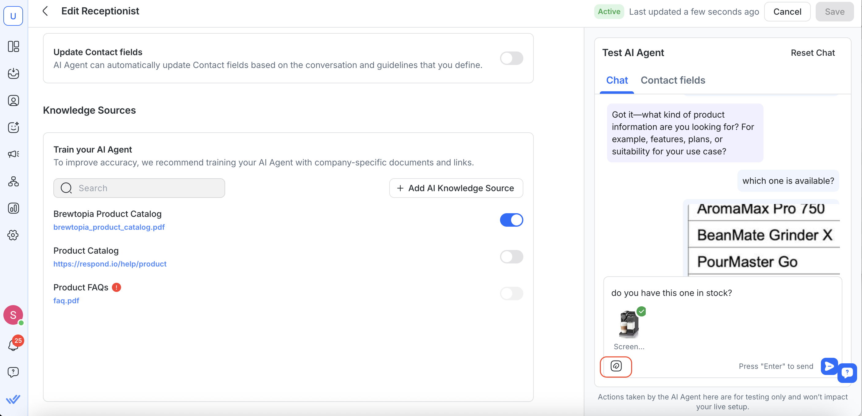 You can also test how your AI Agent reads and processes both text and files â just like real customer conversations.