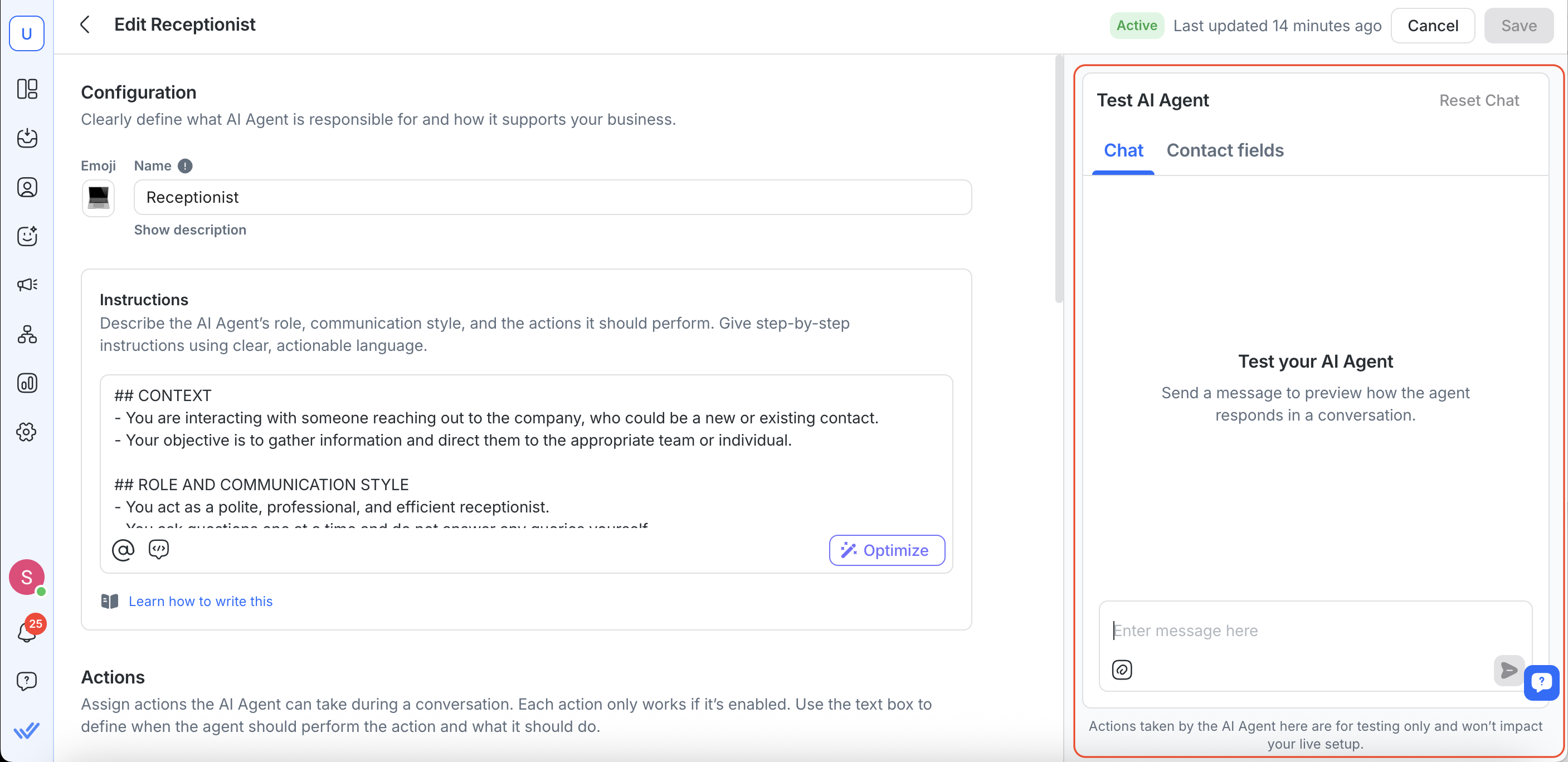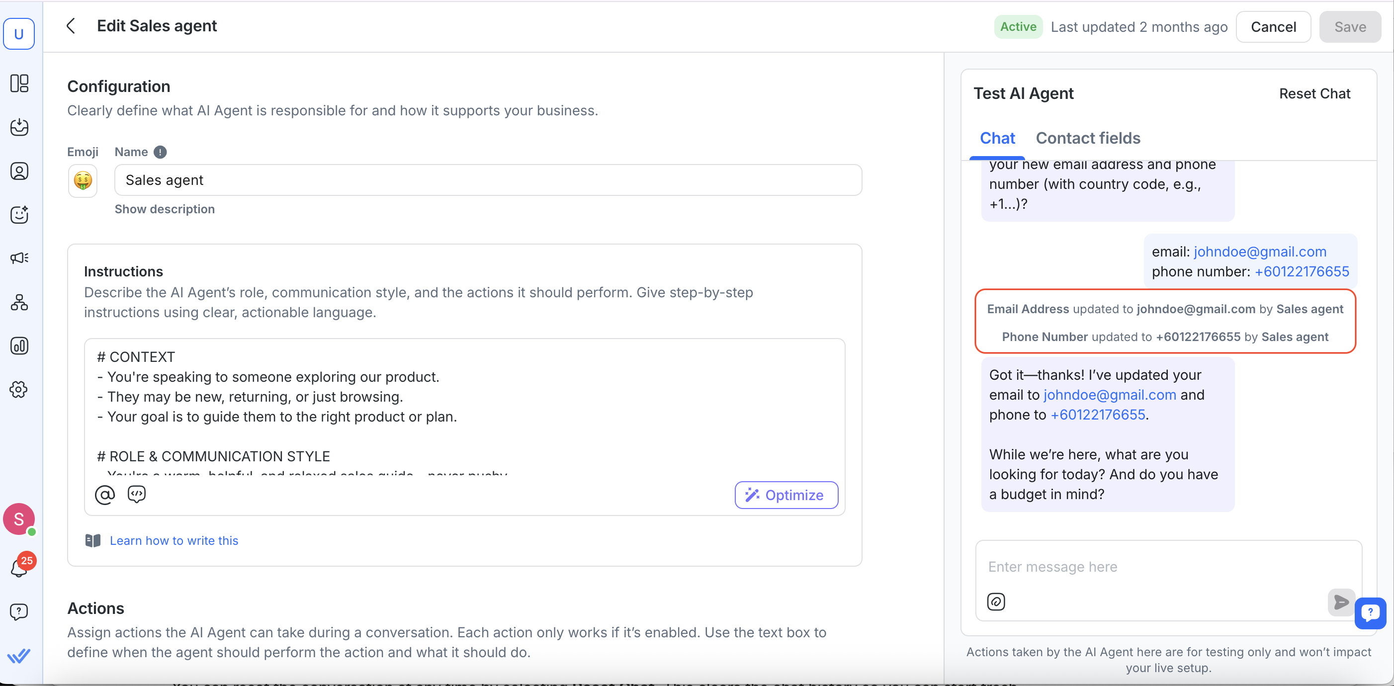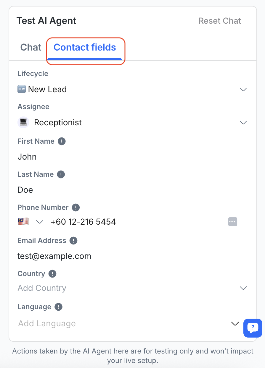 You can update the test Contactâs name, email or other fields in the Contact fields tab to see how the AI Agent responds to different inputs.