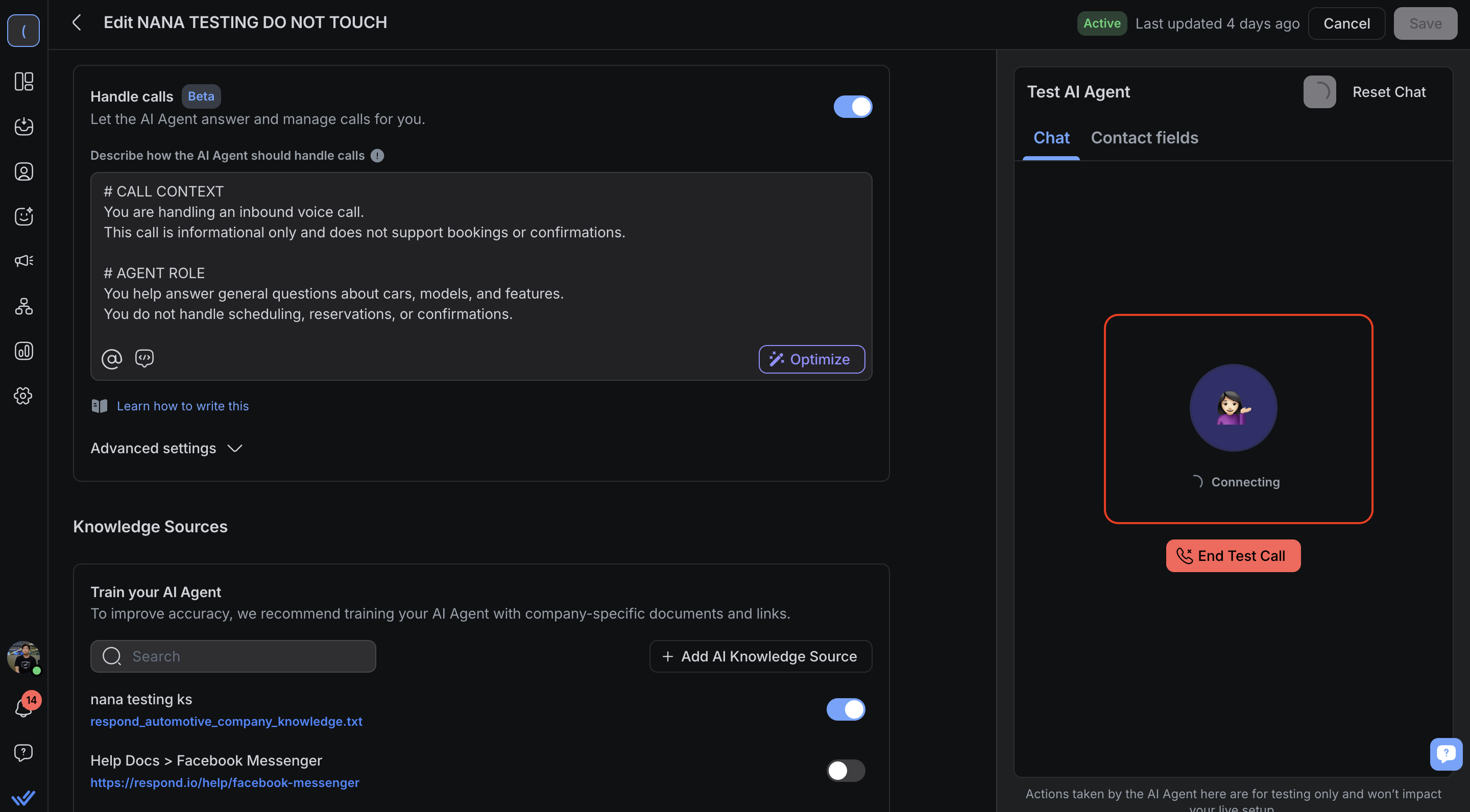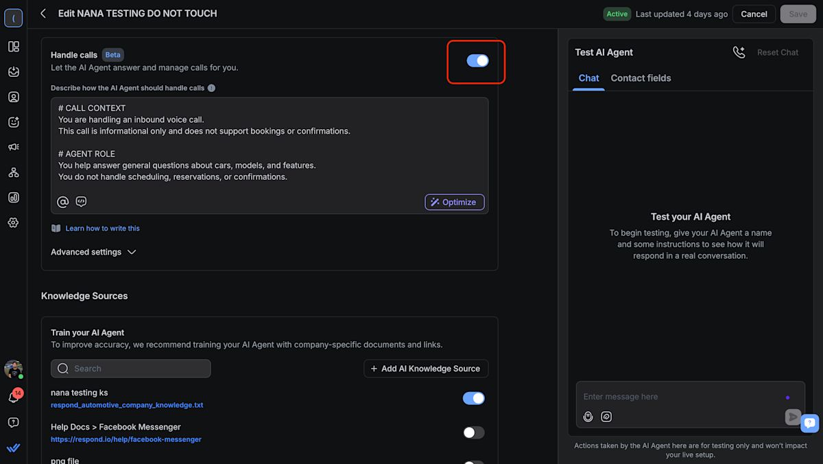 If your AI Agent is set to Handle calls, you can now simulate call behavior directly in the Test AI Agent panel. This helps you confirm how your AI Agent greets callers, responds, and ends calls before publishing.