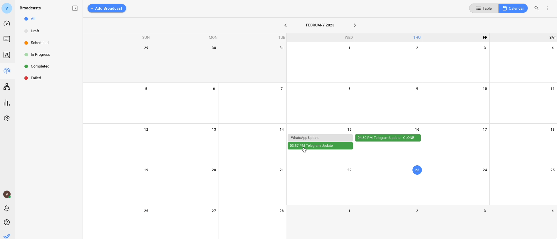 To view and filter your Broadcasts, use the statuses displayed on the left side. Additionally, you can choose your preferred view by selecting the tabs on the top right side.