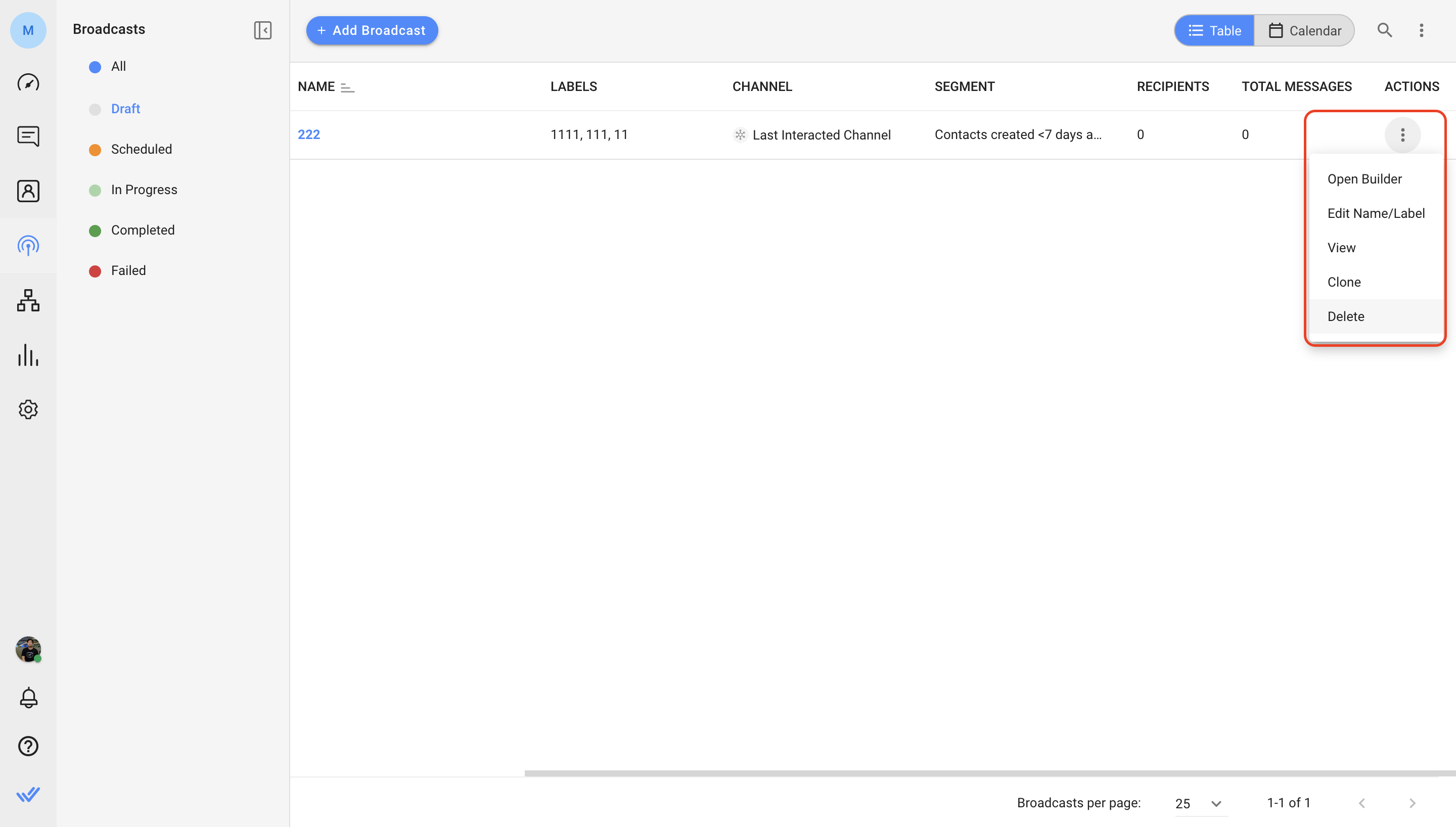 A broadcast can be deleted from your Workspace by selecting Delete from the actions menu.