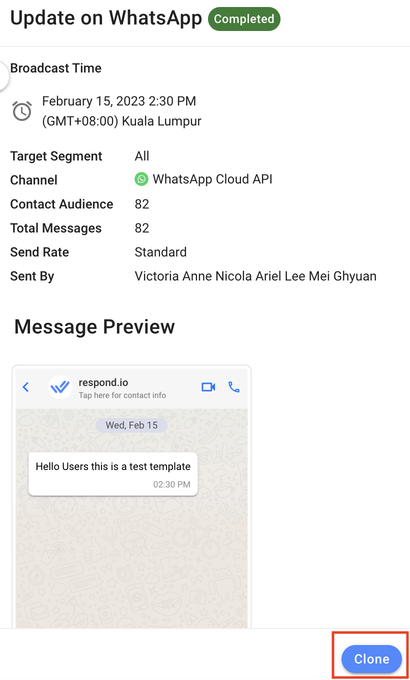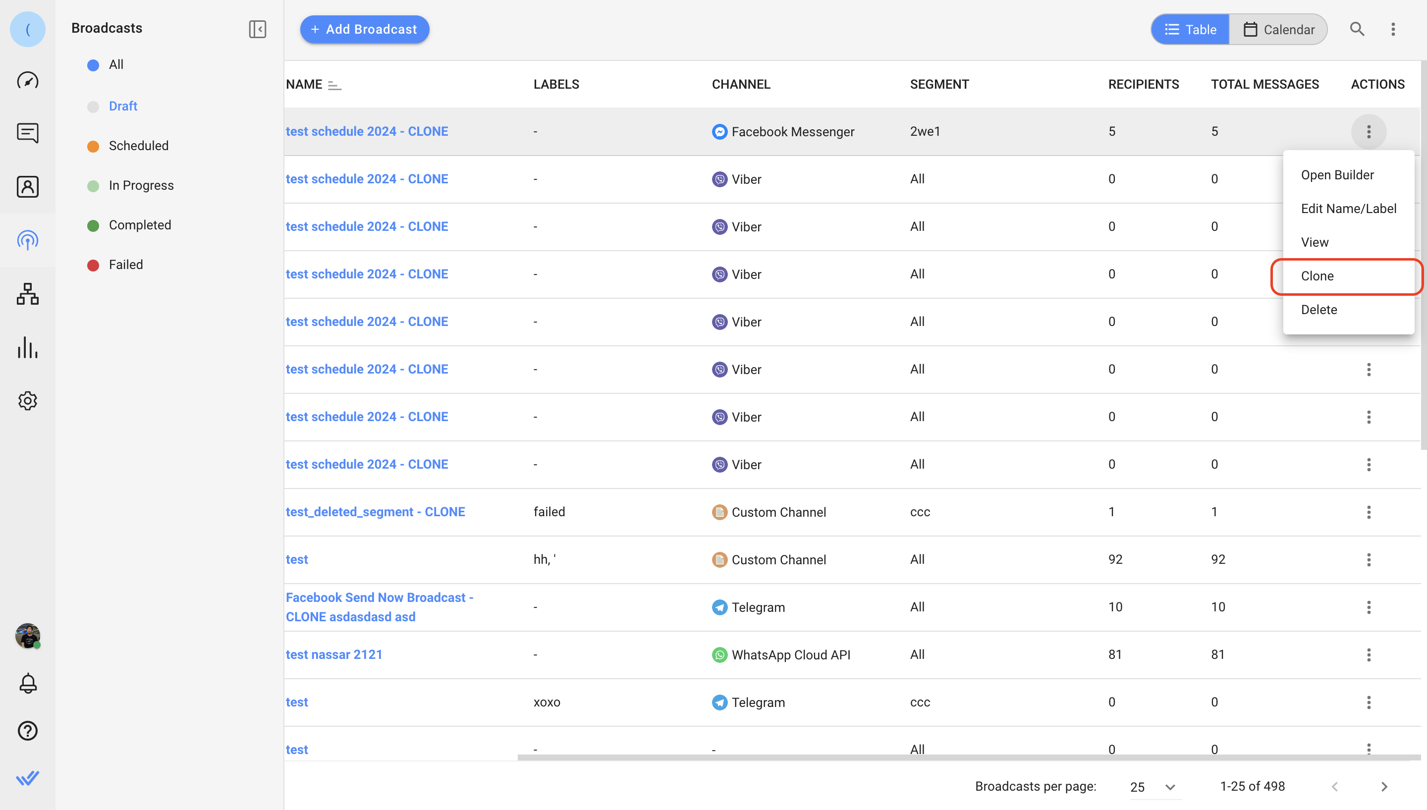 You can create a broadcast similar to an existing one by cloning one (of any status). When a broadcast is cloned, the channel, target audience, content and broadcast time of the original broadcast are copied over to the new broadcast. The name of the new broadcast will also follow the name of the original broadcast and appended with clone at the end. You can still make necessary changes before scheduling it.