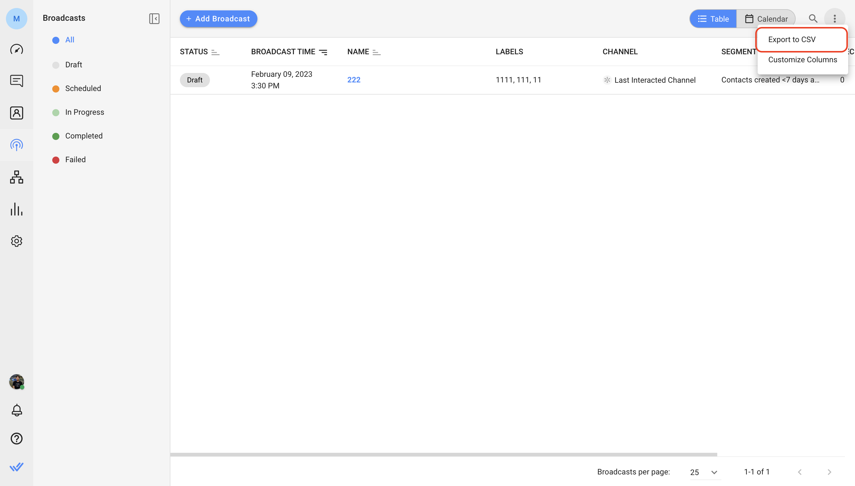 To export the broadcasts shown in the view, select the export option from the actions menu at the top right corner. You may export all your broadcasts to a CSV file for reporting purposes.