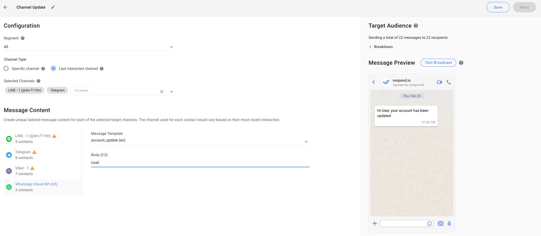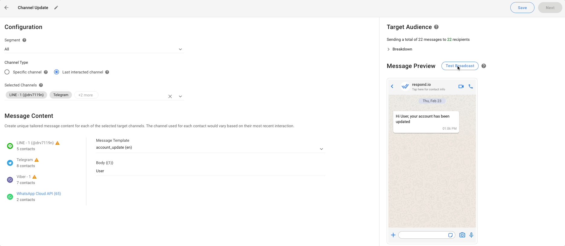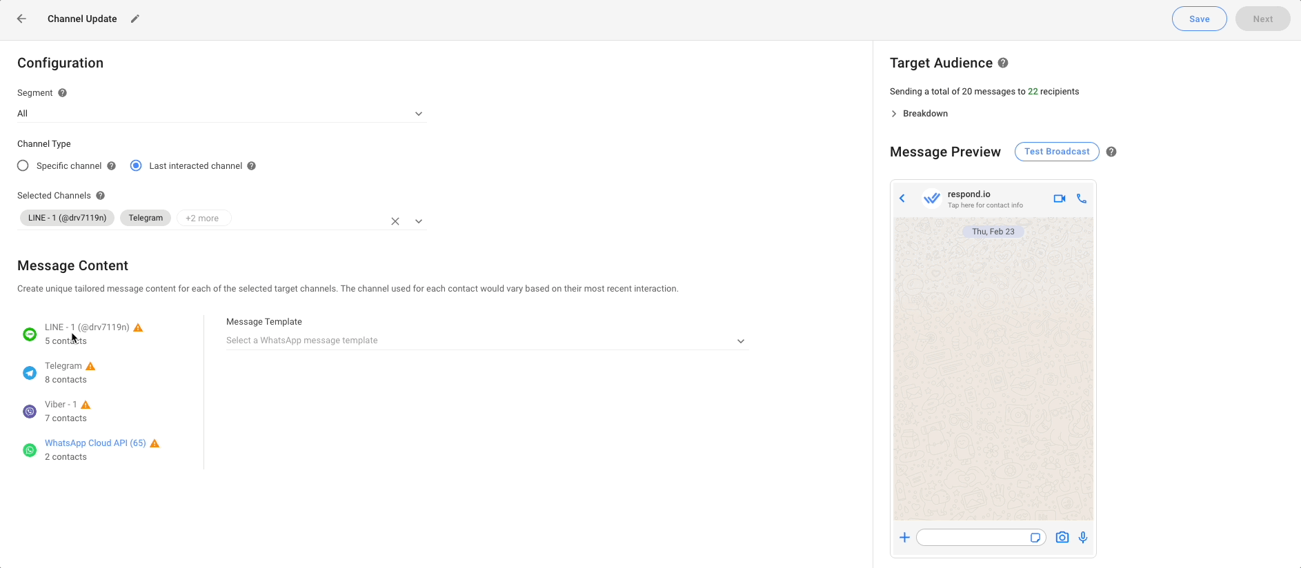 Sending a broadcast to Contacts’ Last Interacted Channel