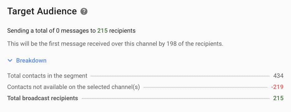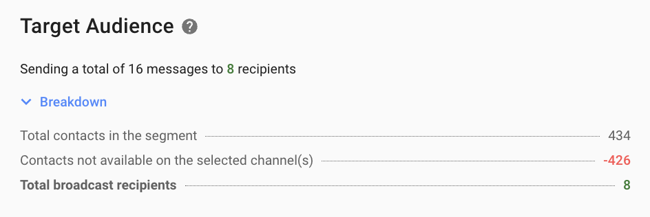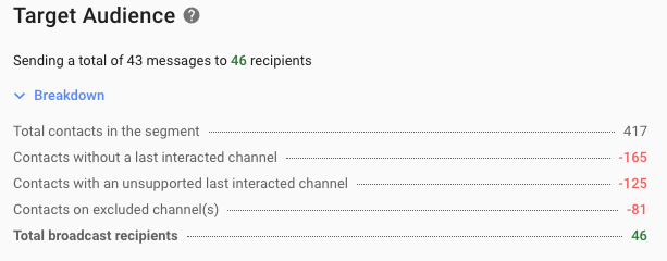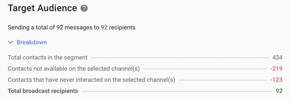 Total broadcast recipients | Total number of Contacts that this broadcast will be sent to. Total broadcast recipients = Total Contacts in the Segment - Contacts not available on the selected Channel(s) - Contacts that never interacted with the selected Channel |
