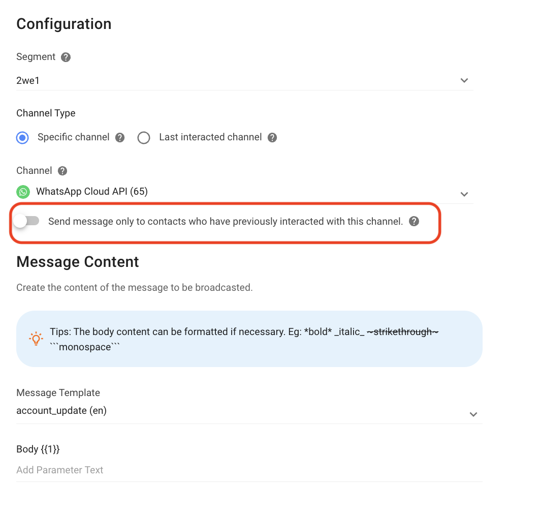 When this toggle is disabled, the broadcast messages will be sent to Contacts who have interacted on the selected Channel AND Contacts who have access to the Channel but have not had any interactions yet.