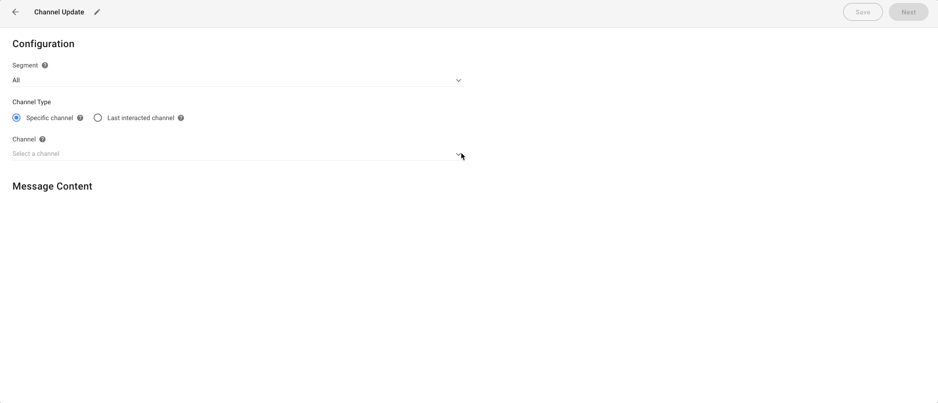 Specific channel: This allows you to send the broadcast to Contacts in that Channel. Any Contacts in your selected Segment without that Channel will be excluded from the broadcast.