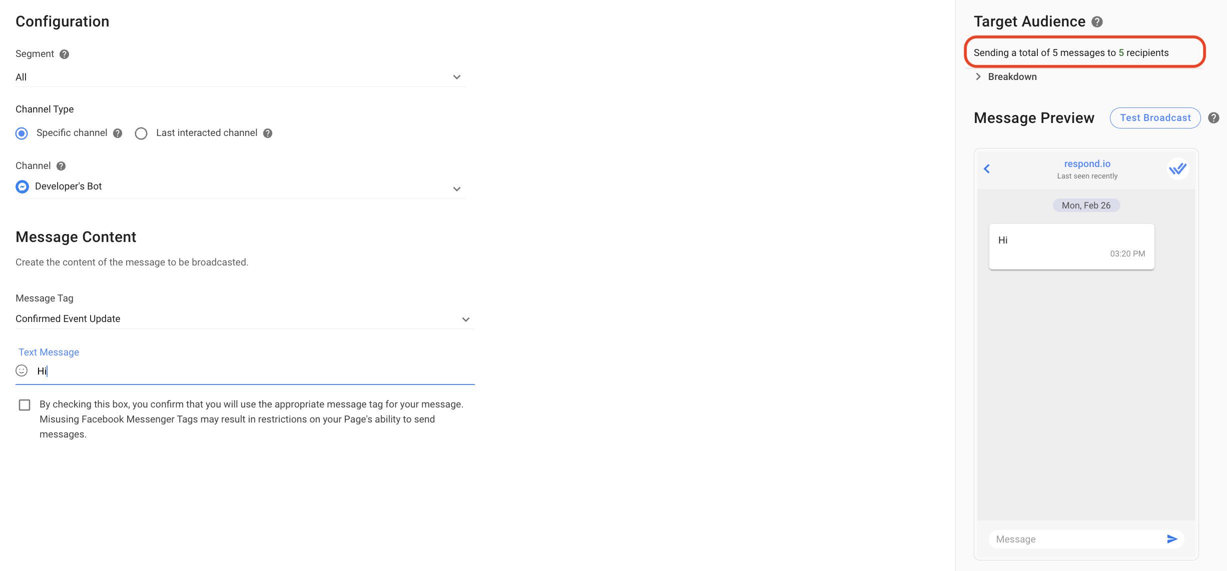 Step 10: Check the Target Audience to see the breakdown of the number of messages being sent and the number of recipients who will receive the broadcast.