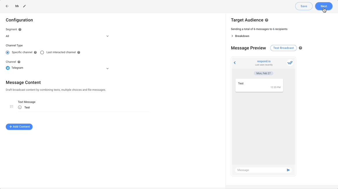 Step 9: Send a test broadcast before sending the actual broadcast. Check how your content will appear to your Contacts. Search for a Contact by name or phone number to receive the test broadcast content. You can search for a Contact as long as they have the Channel available.