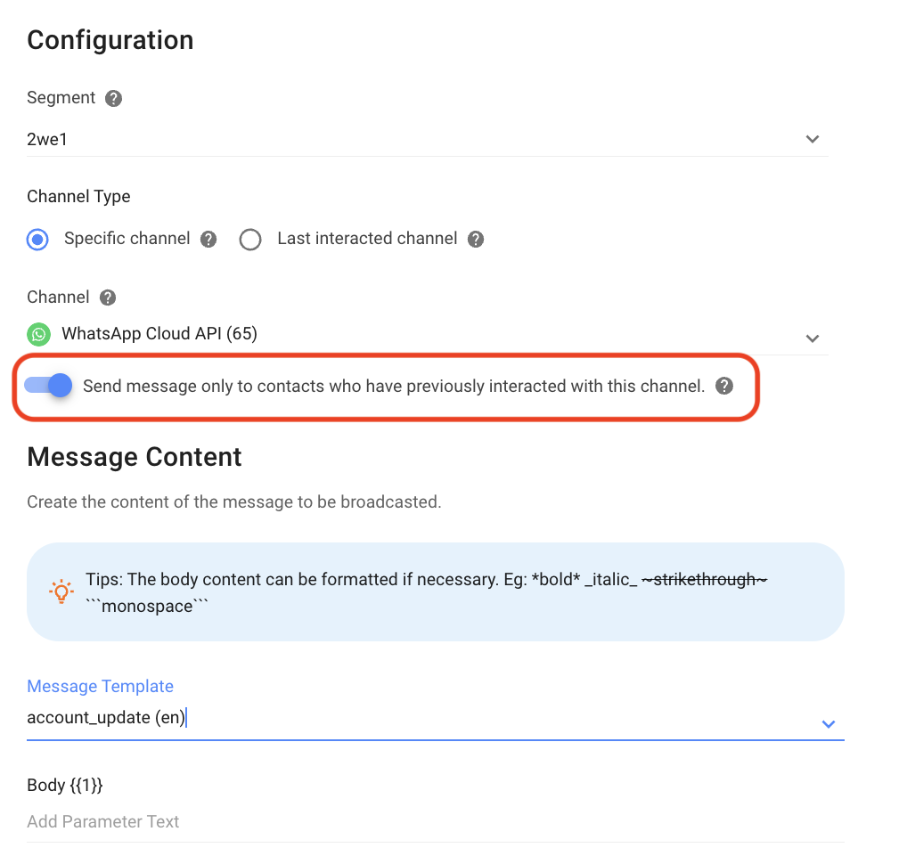 When this toggle is enabled, the broadcast messages will be sent to Contacts who have interacted on the selected Channel.
