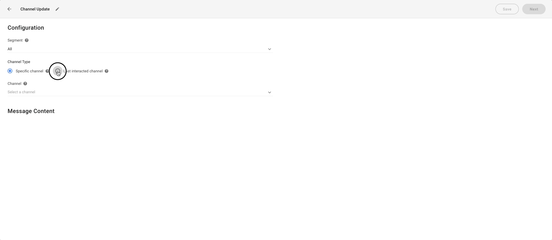 Step 6: At Channel, select the Channel that will be used to send the broadcast message. All channels that are connected and support broadcasts will be available for selection.