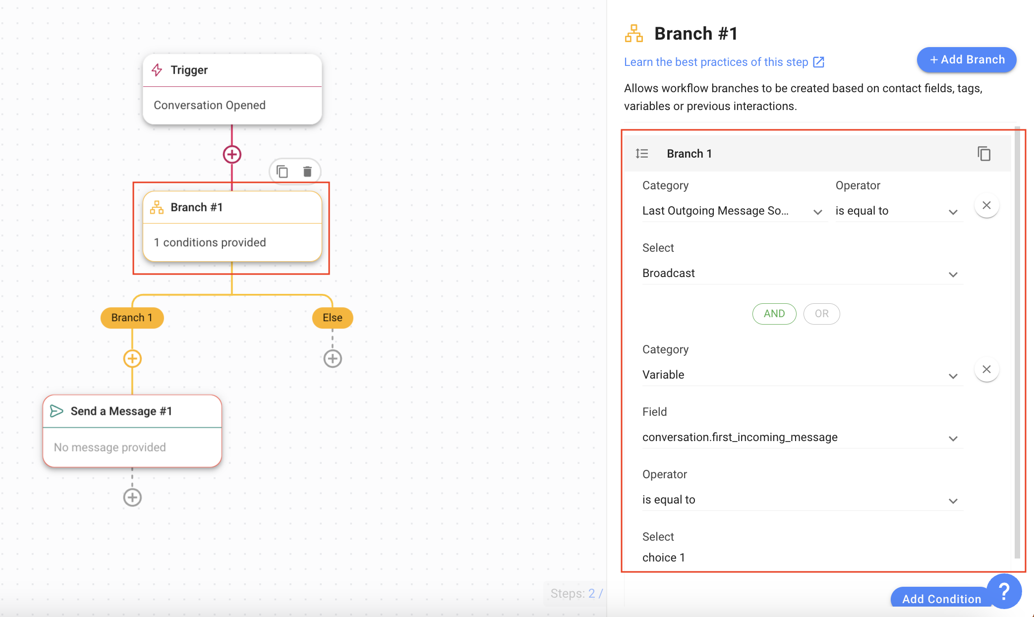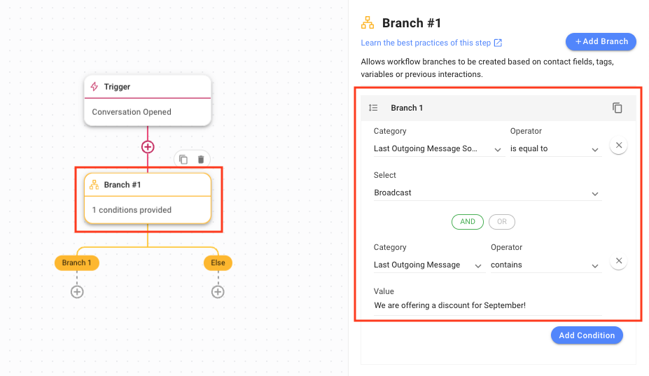 Step 2: Set up the Workflow with a Trigger condition and a Branch condition to check if the last sent message was a Broadcast.