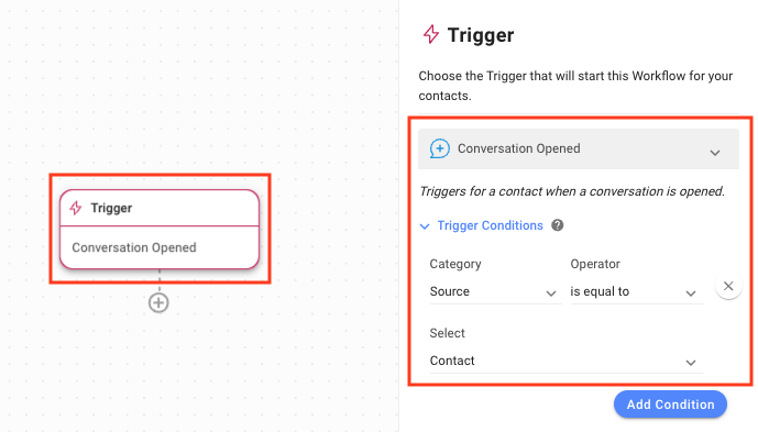 Expand the Trigger Conditions menu and select Source from the Category dropdown list to start the Workflow with the Conversation Opened Trigger.