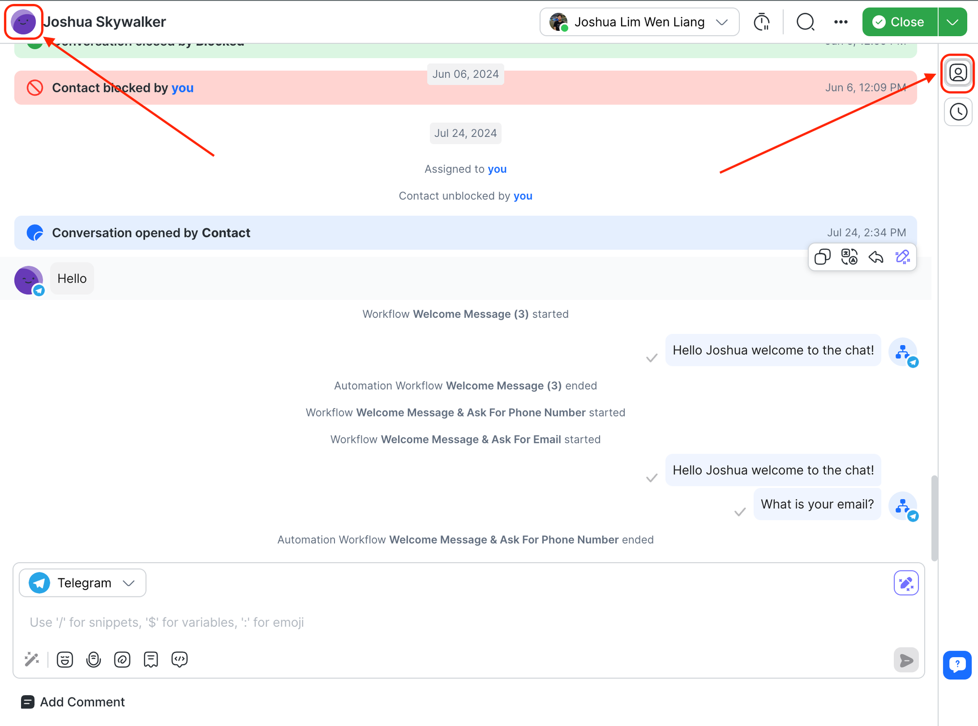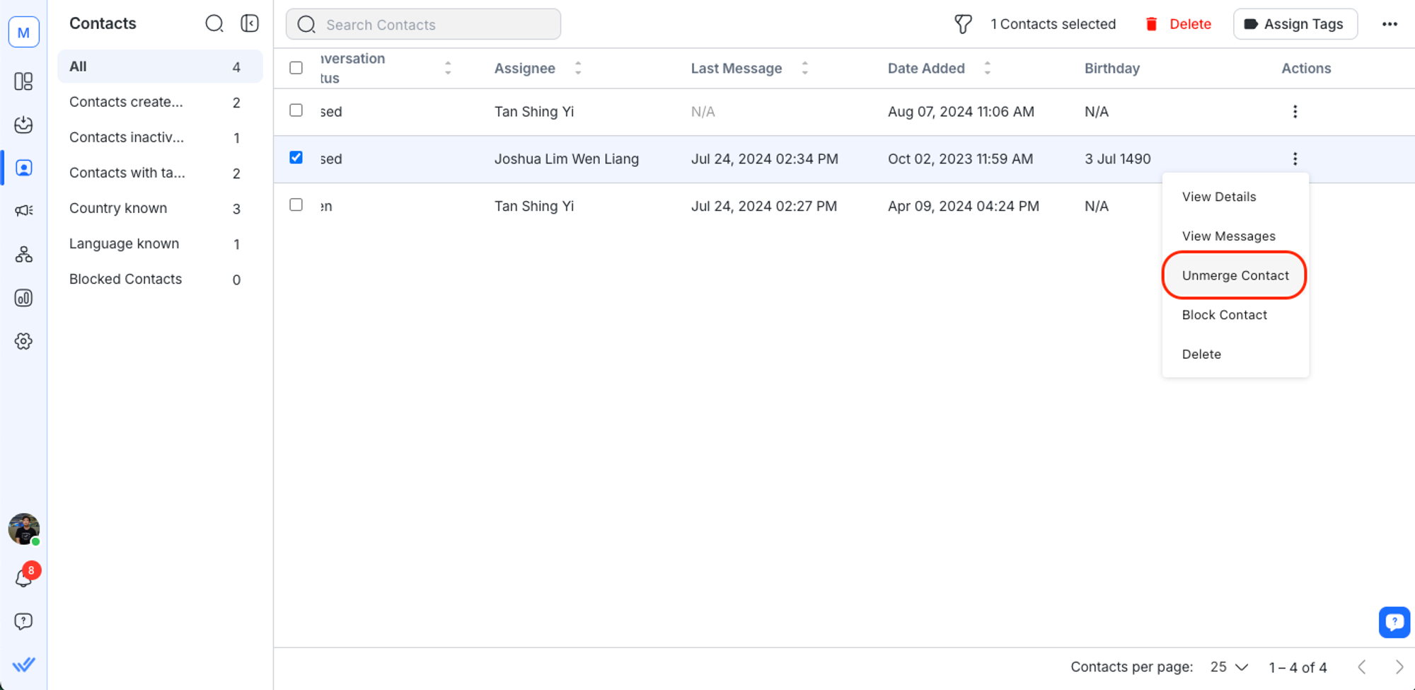 Block / Unblock Contact: Blocks a Contact from future interactions, or unblocks a Contact that you have mistakenly blocked. For a blocked Contact, any incoming messages received will not be reflected on the Inbox Module nor will it trigger any Workflow, and any ongoing Workflows for the Contact will automatically be stopped.