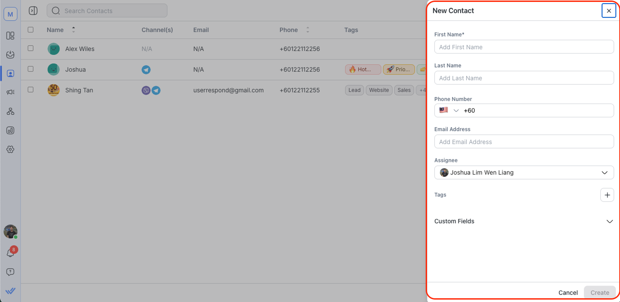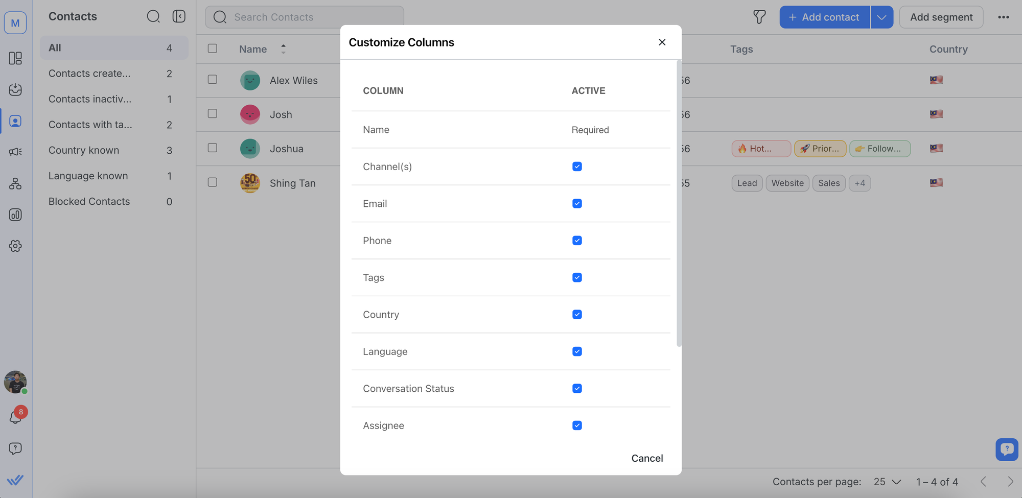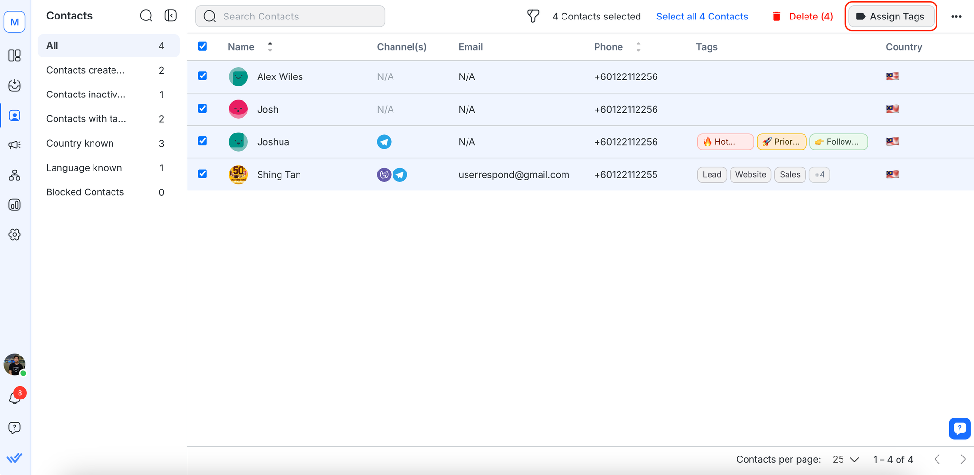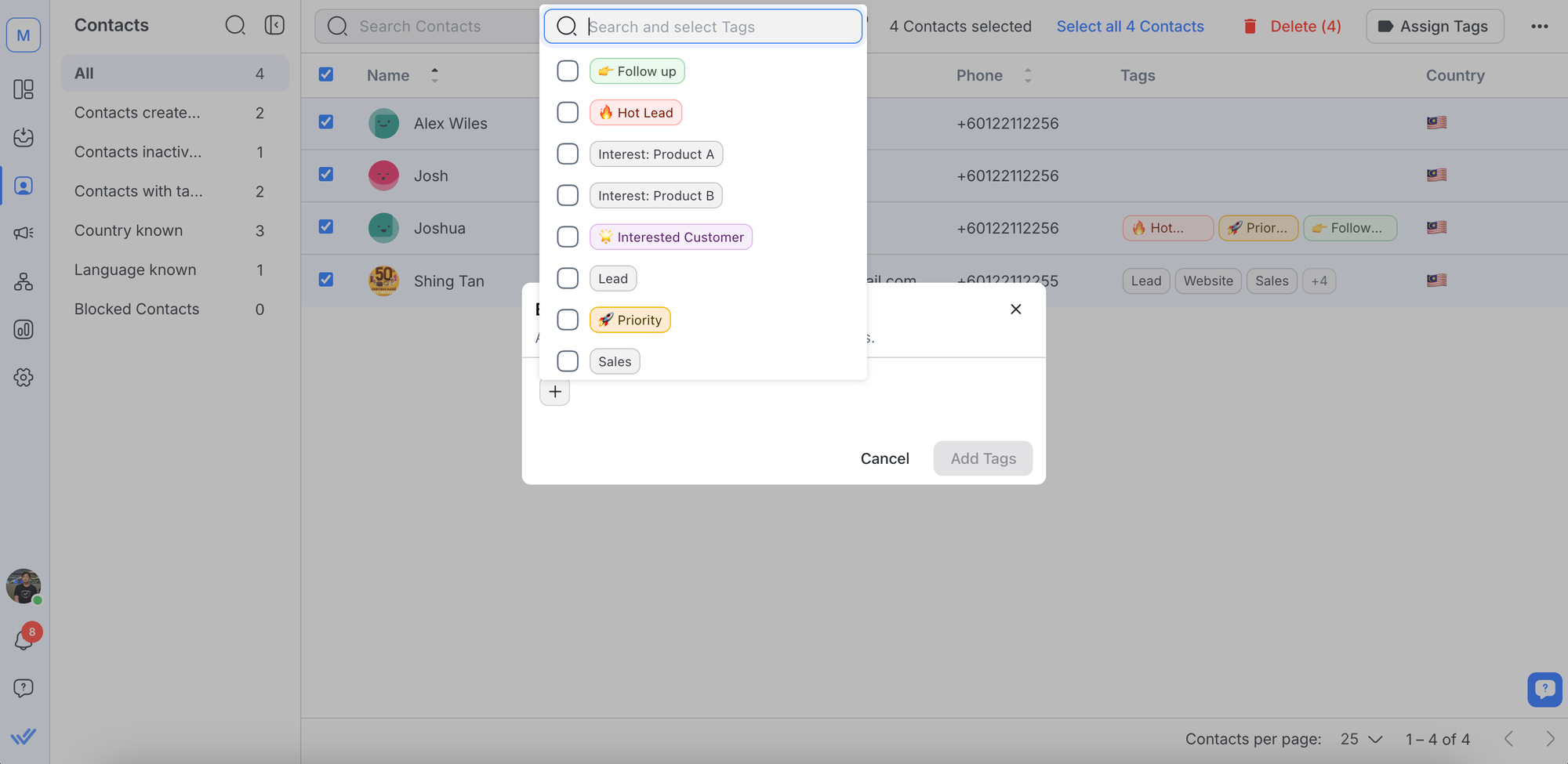 Input your desired tags and click Add Tags to assign the tags to the selected Contacts.